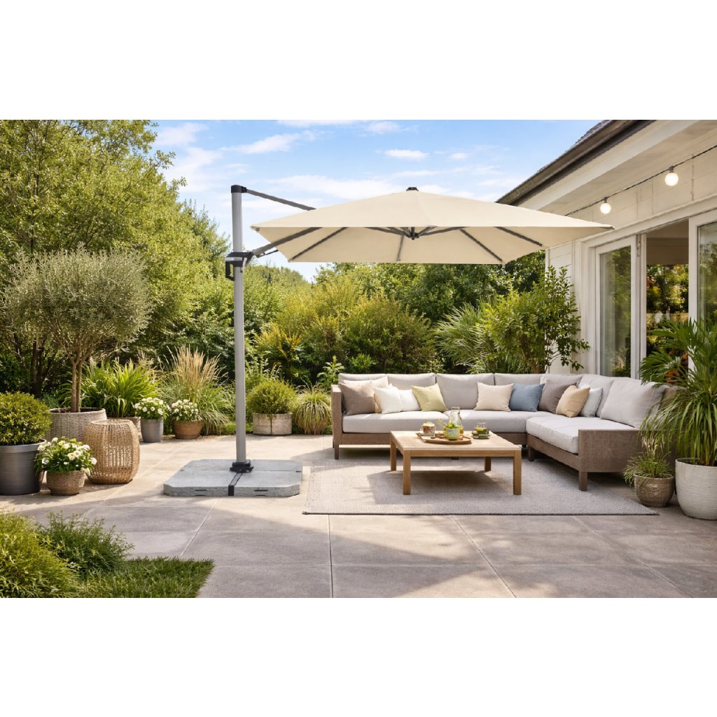 Active 350 x 260 cm je veľmi všestranný a vysoko kvalitný slnečník s pevným hliníkovým rámom. Obdĺžnikový tvar strechy je obzvlášť vhodný na zatienenie záhradného nábytku. Okrem toho sa slnečník dá prispôsobiť pohybu slnka počas dňa, pretože je možné ho otočiť o 360°, natočiť axiálne na obe strany a môže byť nastavený pod uhlom dozadu, čím sa optimálne prispôsobuje pohybu slnka. Poťah je vyrobený z polyesterovej tkaniny odpudzujúcej vodu s dobrou UV ochranou 50+.