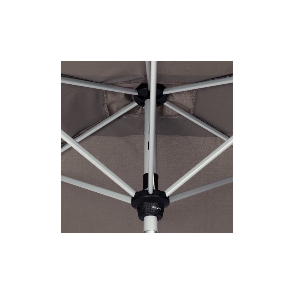 Komfortná funkcia automatického naklápania umožňuje automatické naklopenie strechy iba otočením kľuky. Poťah slnečníka je vyrobený z polyesterovej tkaniny odolnej voči poveternostným vplyvom s dobrou svetelnou stálosťou a dobrou UV ochranou 50+.