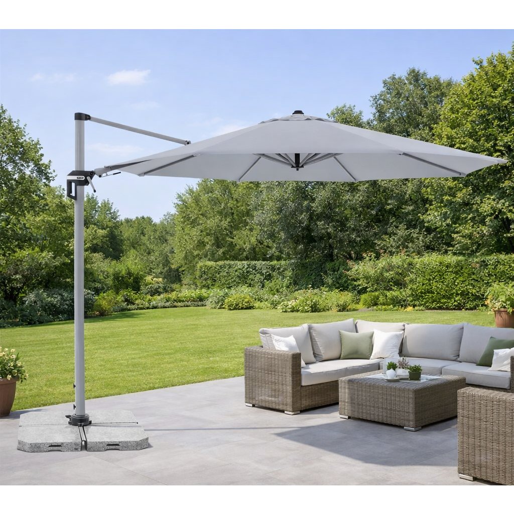 Vysoko kvalitný slnečník Active s bočnou nohou s priemerom strechy 370 cm a gigantickou strechou (viac ako 10m2) je obzvlášť vhodný na zatienenie záhradného posedenia a záhradného nábytku. Pri letnom slnku vám potom zaručí maximum pohodlia a ochranu proti UV žiareniu. Je tiež veľmi stabilný vďaka pevnému, masívnemu hliníkovému rámu. Okrem toho sa slnečník dá jednoducho prispôsobiť pohybu slnka počas dňa, dá sa otočiť až o 360°, naklopiť pod žiadaným uhlom na všetky strany. Slnečník je vrátane základného kríža (bez dlaždíc). Poťah je vyrobený zo 100 % polyesteru odpudzujúceho vodu s dobrou UV ochranou 50+. Vďaka ventilačnému otvoru v streche sa pod slnečníkom nekumuluje horúci letný vzduch.