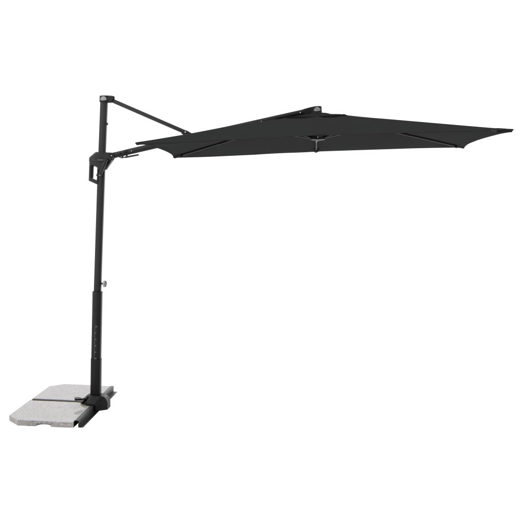 Moderný slnečník s hliníkovou konštrukciou v antracitovej farbe je ideálny na balkón či terasu. Jednoduché a pohodlné otváranie a zatváranie slnečníka vďaka kľukovému mechanizmu. Slnečník je výškovo nastaviteľný. Dá sa prispôsobiť pohybu slnka počas dňa, otáča sa o 360°, naklápa sa axiálne na obe strany a môže byť nastavený pod uhlom dozadu a tak sa optimálne prispôsobuje pohybu slnka. Poťah je vyroben zo 100% PET recyklovanej polyesterovej tkaniny a má UV ochranu 50+. Touto novou kolekciou ""GREEN EDITION"" nasledujeme trend udržateľnosti materiálov a výrobkov.
