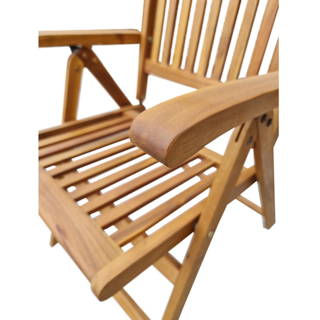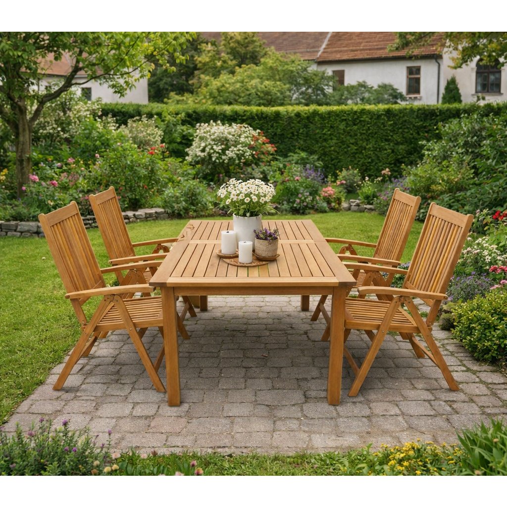 Súprava obsahuje štyri polohovacie kreslá, ktorých opierky možno nastaviť do rôznych uhlov pre maximálne pohodlie. Keď ich práve nepoužívate, jednoducho ich zložíte a ušetríte miesto. Robustné drevené podrúčky a možnosť doplnenia o pohodlné čalúnenie (odporúčame radu MOTION XL -majú exkluzívnu hrúbku 8 cm a sú špeciálne určené pre lamelový nábytok) robia z tejto zostavy skvelé miesto na oddych.