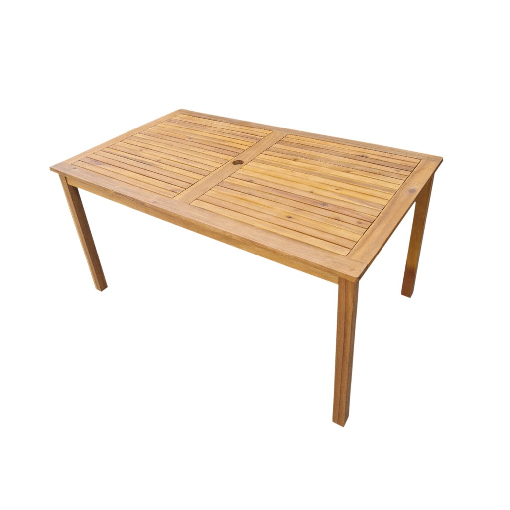 Celý komplet dopĺňa stabilný drevený stôl v jednoduchom štýle, ktorý ľahko zladíte s ďalším záhradným nábytkom.