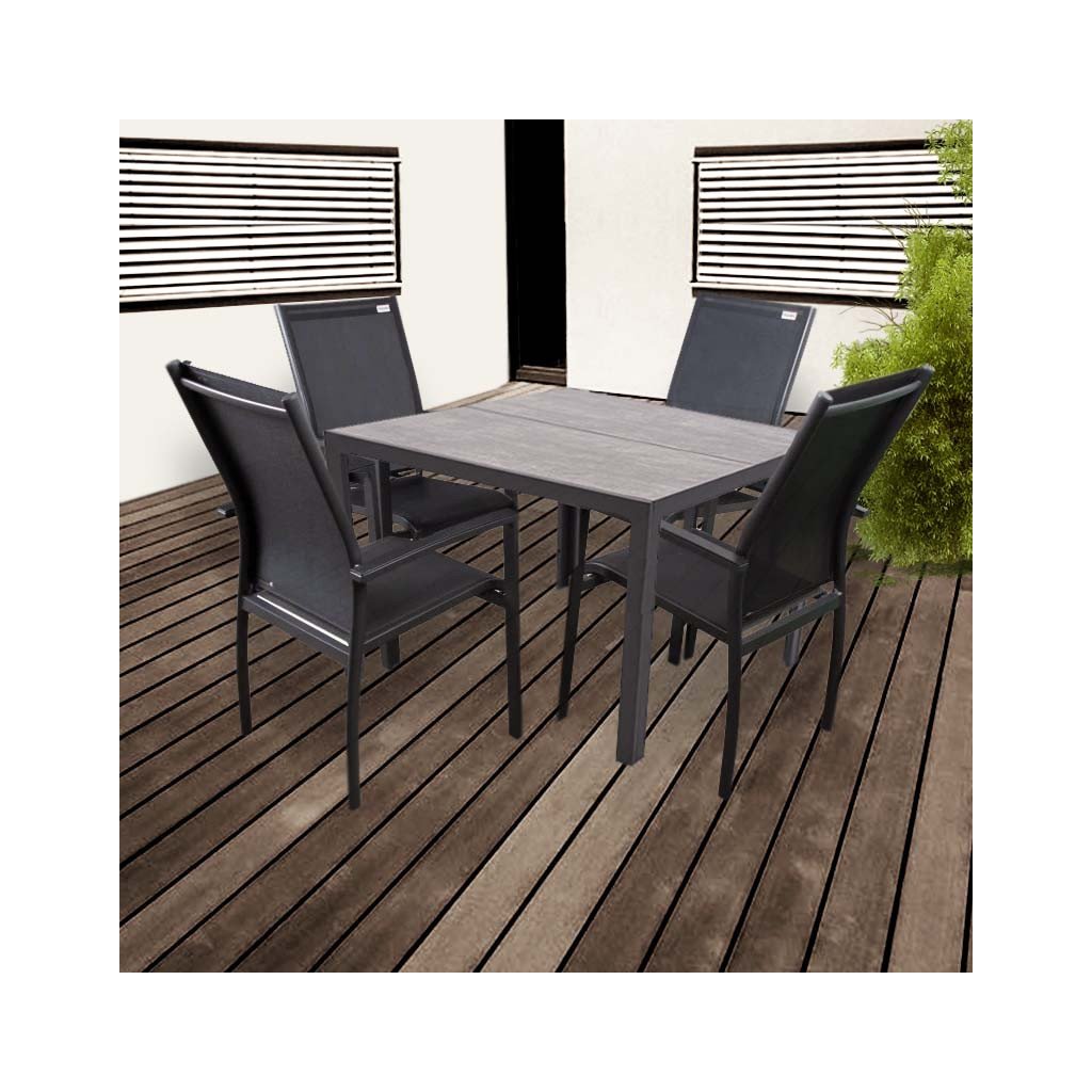 Stôl Bergamo zase zaujme svojou krásnou keramickou doskou žíhanej sivej farby. Tú dopĺňa odolná hliníková konštrukcia ošetrená práškovým nástrekom v antracitovej farbe, ktorý stôl chráni pred koróziou a výrazne predlžuje jeho životnosť.