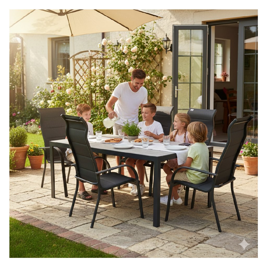 Súčasťou súpravy je aj stôl Bergamo vo veľkosti 180 x 90 cm. Stôl má odolnú hliníkovú konštrukciu ošetrenú práškovým nástrekom v antracitovej farbe, ktorý stôl chráni pred koróziou a výrazne predlžuje jeho životnosť. Veľkou prednosťou stola je aj jeho odolná keramická doska krásnej žíhanej sivej farby.