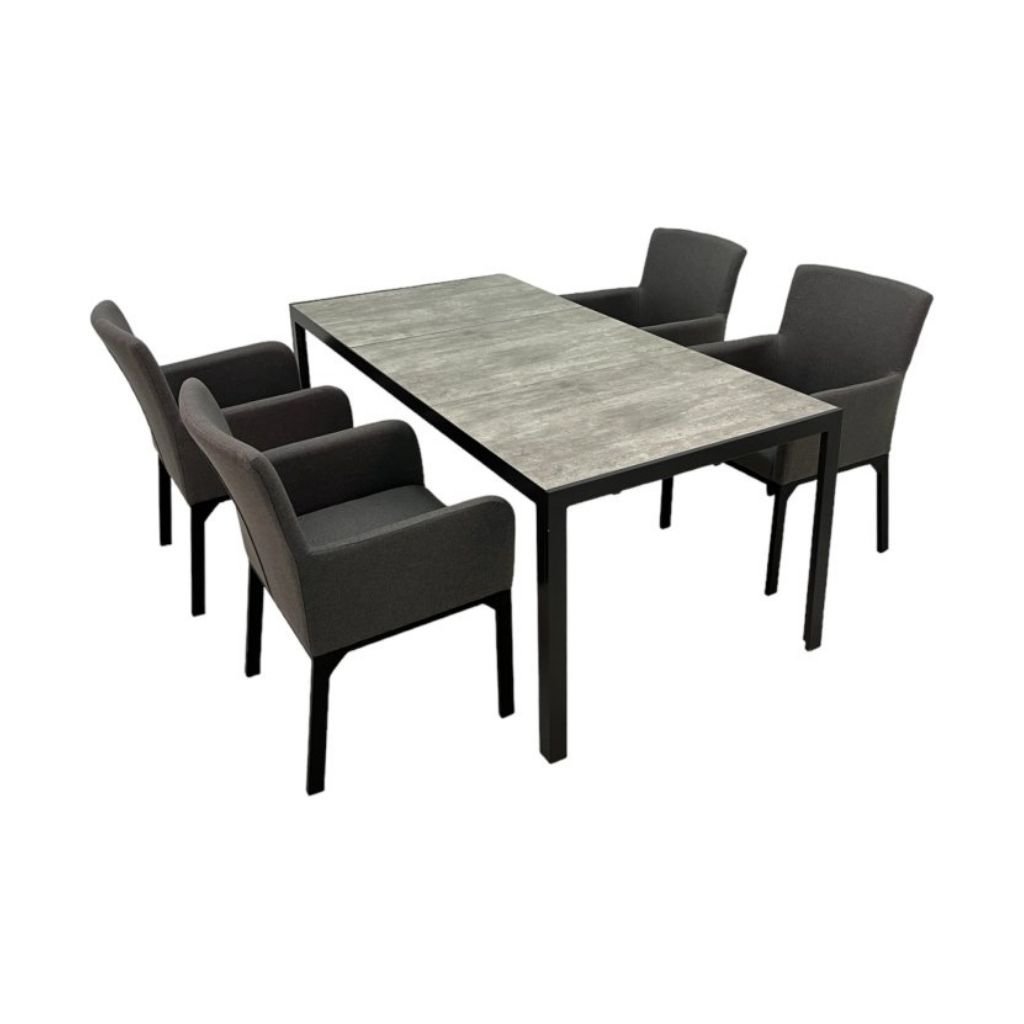 Skladá sa zo 4 dizajnových kresiel TOMBOLO so stabilnou hliníkovou konštrukciou v antracitovej farbe. Moderné čalúnené kreslo z látky Olefin v sivej farbe je novinkou tohto roka a rozširuje radu celočalúnených jedálenských kresiel z odolných materiálov. Materiál Olefin je syntetická tkanina s vynikajúcimi vlastnosťami pre vonkajšie použitie, vhodná aj do záťažových prevádzok. Vlastnosti: odolnosť voči oderu, odolnosť v ťahu, vysoká svetlostálosť, príjemná na dotyk, odolná voči škvrnám, odpudzuje nečistoty a je rýchloschnúca. Výplň kresla je rýchloschnúca pena. Konštrukcia je veľmi ľahká napriek tomu pevná a stabilná.