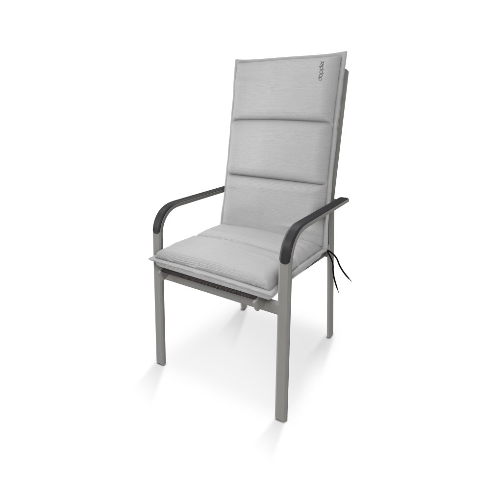 Poduška s vysokou opierkou radu CITY. Elegantná poduška v módnom odtieni, dekorovaná výšivkou Doppler na operadle. Poduška je v prevedení s obšitým lemom, prešitá 1x v sedáku, 2x v operadle. Uchytenie je pomocou posuvnej spony. Vďaka spone si môžete nastaviť veľkosť podľa rozmeru a druhu stoličky, spona je pevná a nevyťahuje sa. Upevnenie sedáku je pomocou dvoch šnúrok v ohybe podušky. Hrúbka podušky je optimálna pre všetky druhy stoličiek. Prevedenie je vhodné aj do náročných podmienok kaviarní, záhradiek a reštaurácií. Poťah je nesnímateľný.