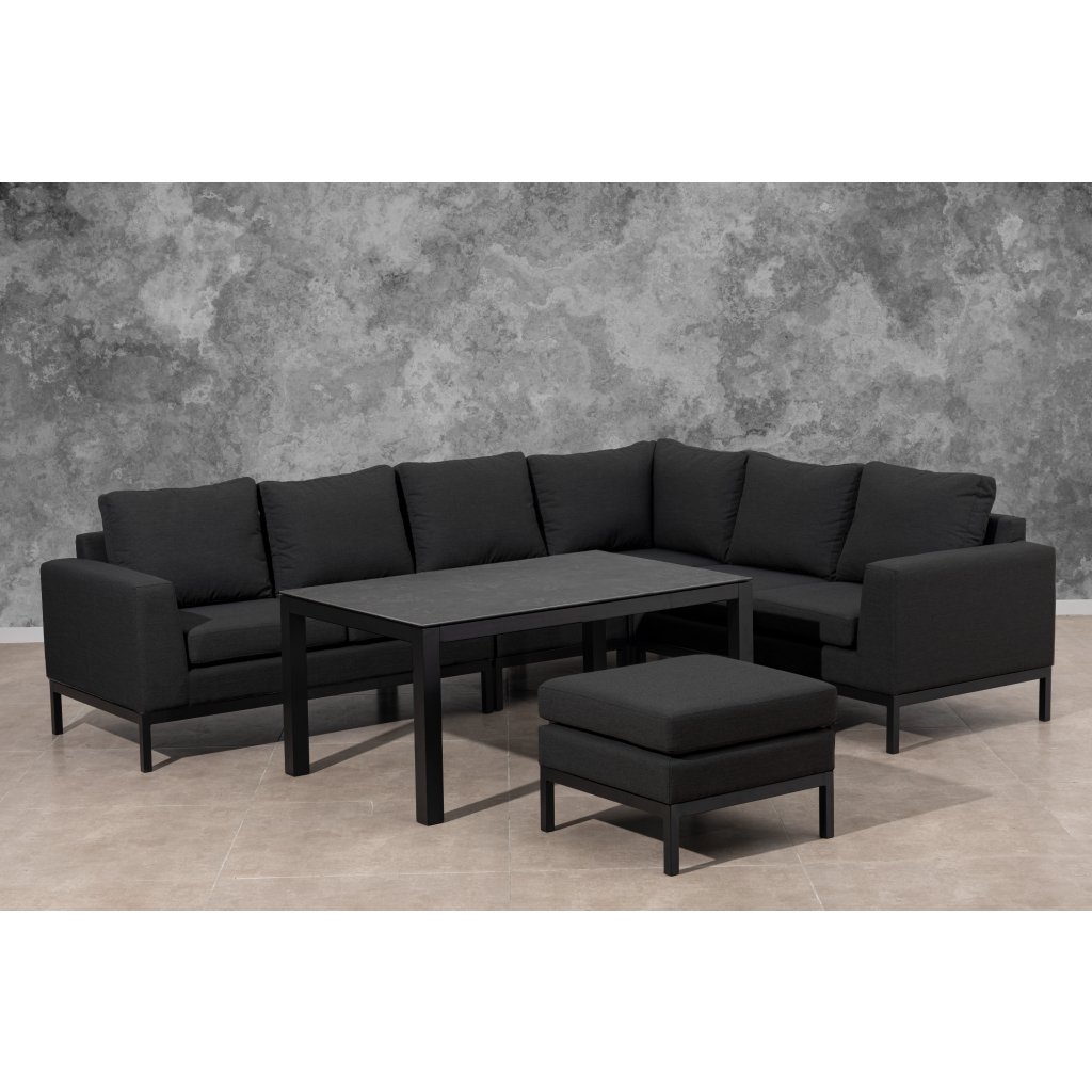 Konštrukcia je vyrobená z ľahkého odolného a bezúdržbového hliníka. Zostava obsahuje rohovú pohovku, rohový diel, lavicu, kreslo, taburet a stôl. Súčasťou sú nadýchané tmavosivé polstre, poťahy sú snímateľné (možno ich prať) a sú vyrobené z vysoko kvalitnej textílie LIKA-TEX®.