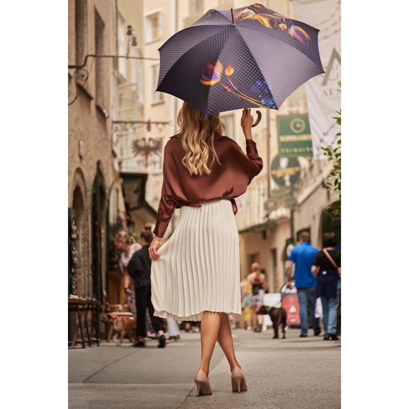 Exkluzívny luxusný dámsky holový vystreľovací dáždnik z radu Manufaktur Boheme, ktorý je ručne vyrobený v Rakúsku. Potlač dáždnika s výrazným motívom plameňov v jasných farbách upúta na prvý pohľad. Strecha je vyrobená z vysoko kvalitnej talianskej žakárovej textílie, ktorá je príjemná na dotyk a dodáva vzoru jemné odlesky. Dáždnik je vybavený...
