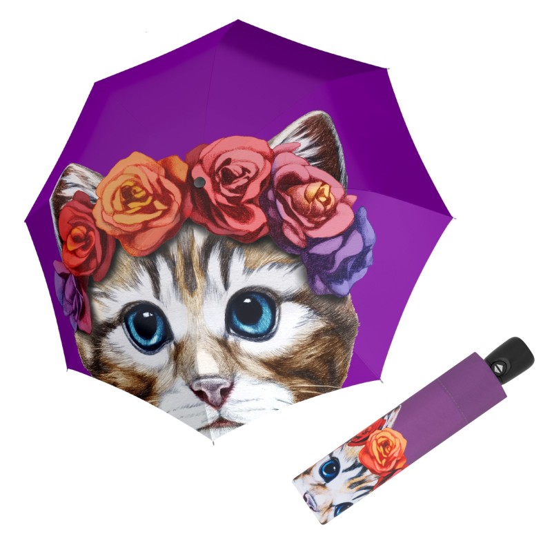 Dámsky plne automatický dáždnik s motívom. Veľmi kvalitná čierna konštrukcia zo sklolaminátu a ocele. Posledné dva diely zo sklolaminátu, pri prevrátení dáždnika vetrom nedôjde k jeho poškodeniu, dáždnik sa ľahko preklopí späť do pôvodnej polohy.Polyesterový poťah je odolný voči zmenám vlhkosti a teplôt, nezráža sa.