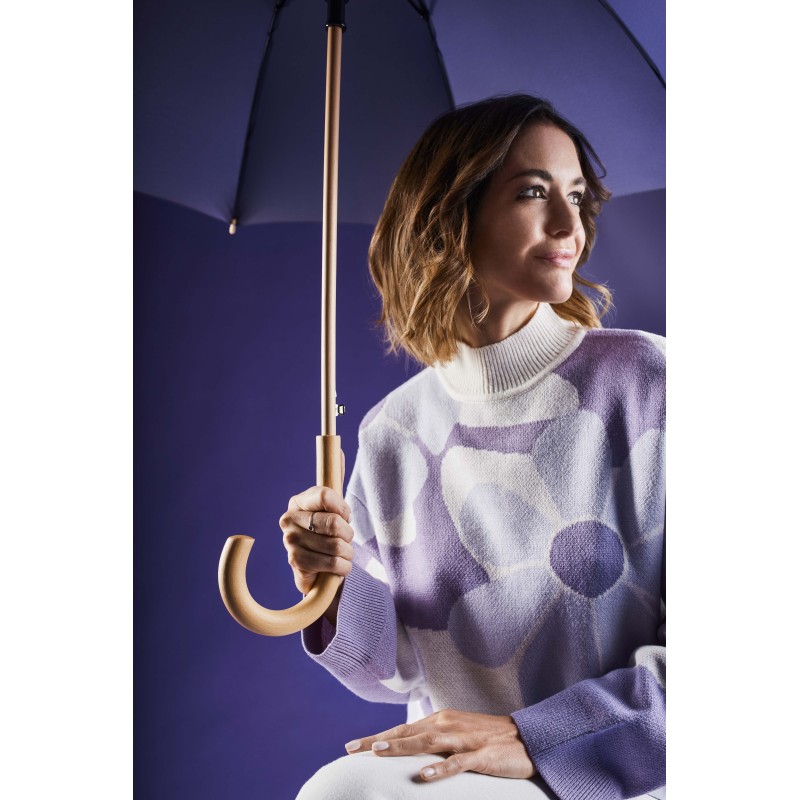 Dámsky holový dáždnik. Vyrobený z eko materiálov šetrných k životnému prostrediu, 3 ročná záruka. Vetruodolný – testovaný vo veternom tuneli do 100 km/hod (plne automatické) tkanina dáždnika vyrobená z 2 recyklovaných pet fliaš, drevo schima superba. 100% pfc free – vodoodpudivosť je zaistená látkami, ktoré neobsahujú chybné chemikálie označované ako c8.