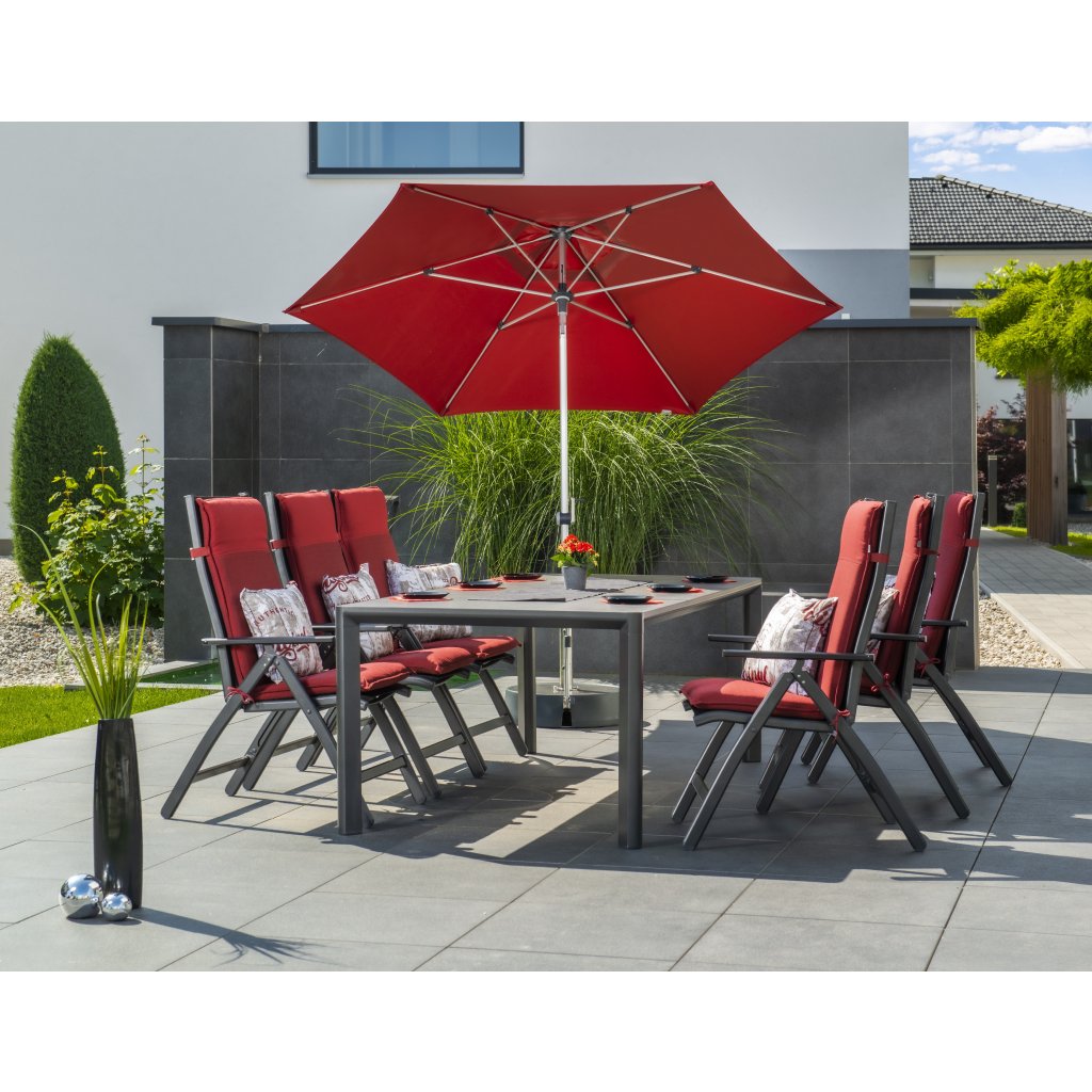 Tento moderný, ľahký, stabilný slnečník je ideálnym spoločníkom na balkón, terasu alebo záhradu. Slnečník má kvalitnú hliníkovú konštrukciu a funkciu automatického naklápacieho kĺbu. Možno výškovo nastaviť. Poťah je vyrobený z 100% polyesterovej tkaniny odolnej poveternostným vplyvom s vynikajúcou UV ochranou 80+. Má snímateľný poťah na ručné pranie. Vďaka ventilačnému otvoru v streche sa pod slnečníkom nekumuluje horúci letný vzduch.