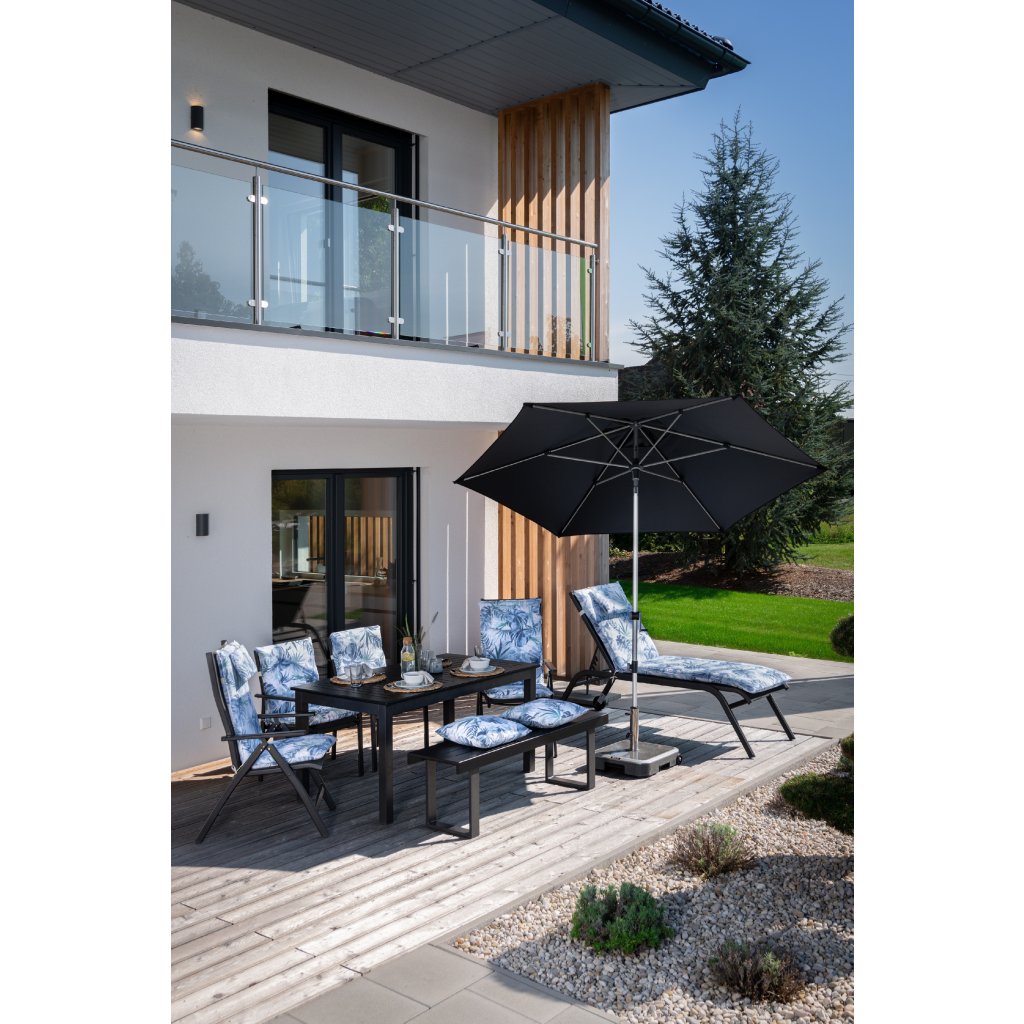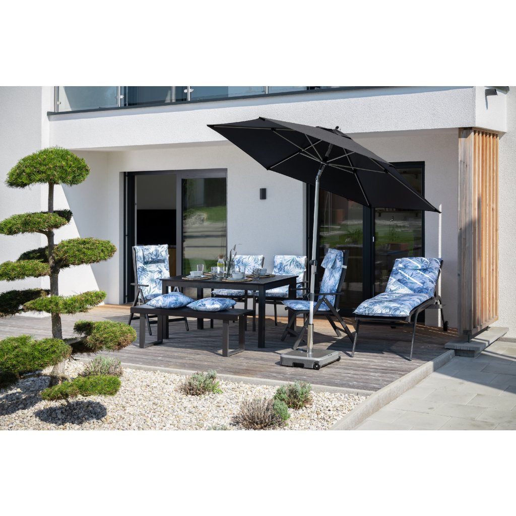 Tento moderný, ľahký, stabilný slnečník je ideálnym spoločníkom na balkón, terasu alebo záhradu. Slnečník má kvalitnú hliníkovú konštrukciu a funkciu automatického naklápacieho kĺbu. Okrem toho ho možno výškovo nastaviť. Poťah je vyroben zo 100% polyesterovej tkaniny odolnej poveternostným vplyvom s vynikajúcou UV ochranou 80+. Má snímateľný poťah pre ručné pranie. Vďaka ventilačnému otvoru v streche sa pod slnečníkom nekumuluje horúci letný vzduch.