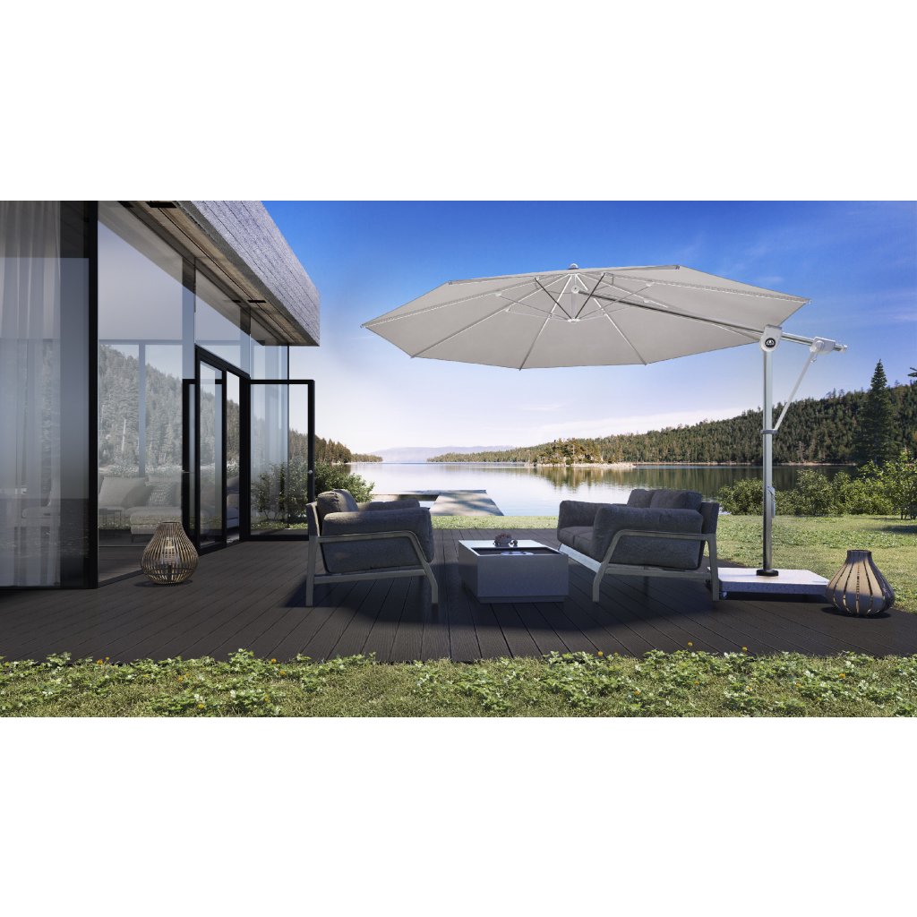 Slnečník je otočný o 360 ° a disponuje bočným naklápaním, takže ho môžete ľahko prispôsobiť pohybu slnka. Dlhodobo bezproblémovú prevádzku pri otváraní a zatváraní slnečníka zaisťuje novo vyvinutý ozubený hnací remeň a kvalitná európska výroba.