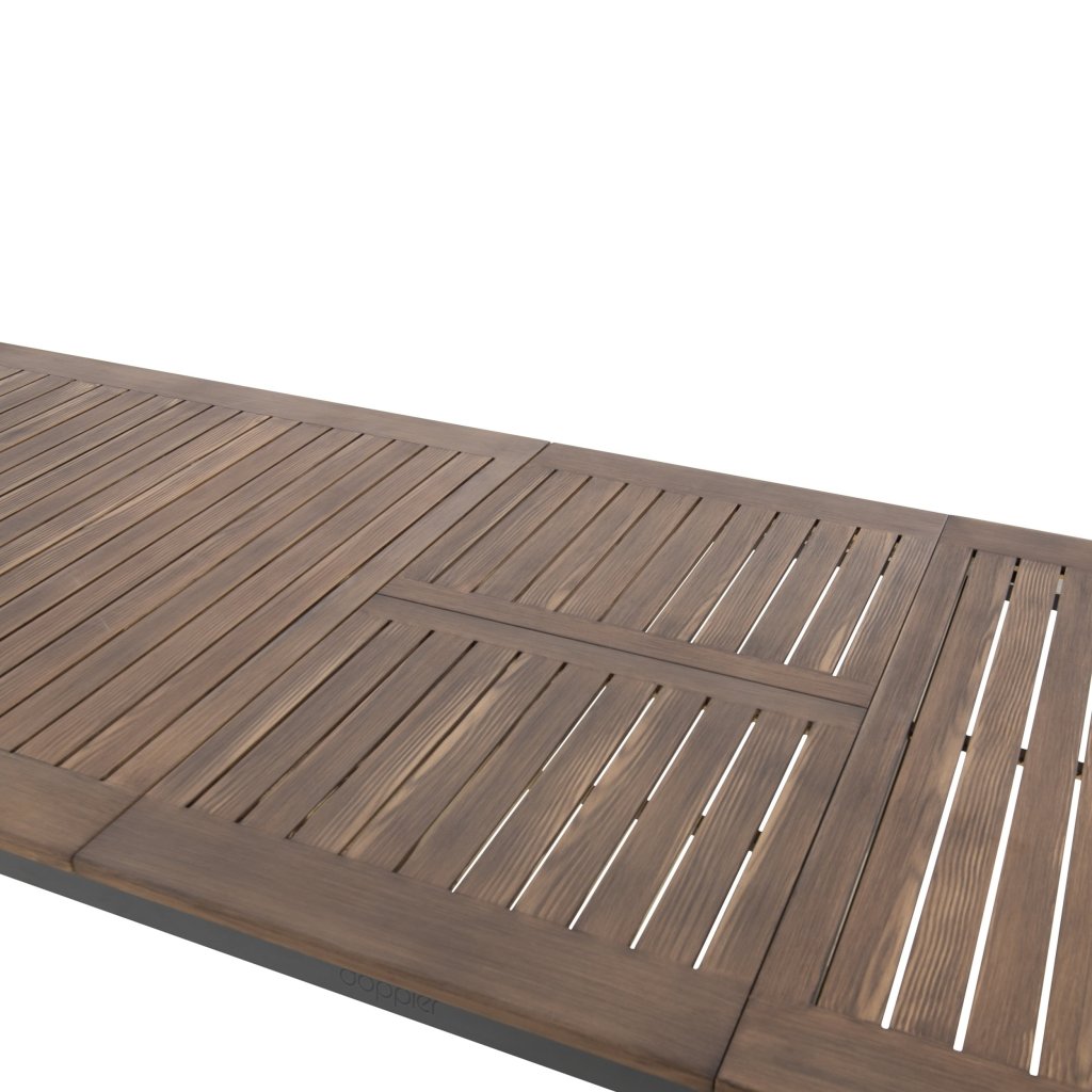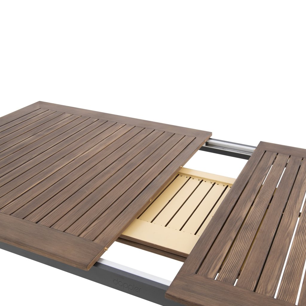 Stôl Expert Wood Plus vyniká svojou odolnou hliníkovou konštrukciou v elegantnej antracitovej farbe, ktorá zaisťuje stabilitu a dlhú životnosť, pričom zostáva ľahký a ľahko manipulovateľný. Rebrovaná hliníková doska s práškovým nástrekom v tóne tmavého dreva dodáva stolu prirodzený vzhľad dreva, bez toho, aby vyžadovala náročnú údržbu. Vďaka jednoduchému rozkladaciemu mechanizmu možno stôl ľahko predĺžiť, čo umožňuje jeho variabilné využitie – či už pri rodinných večeriach, alebo pri väčších oslavách s priateľmi.