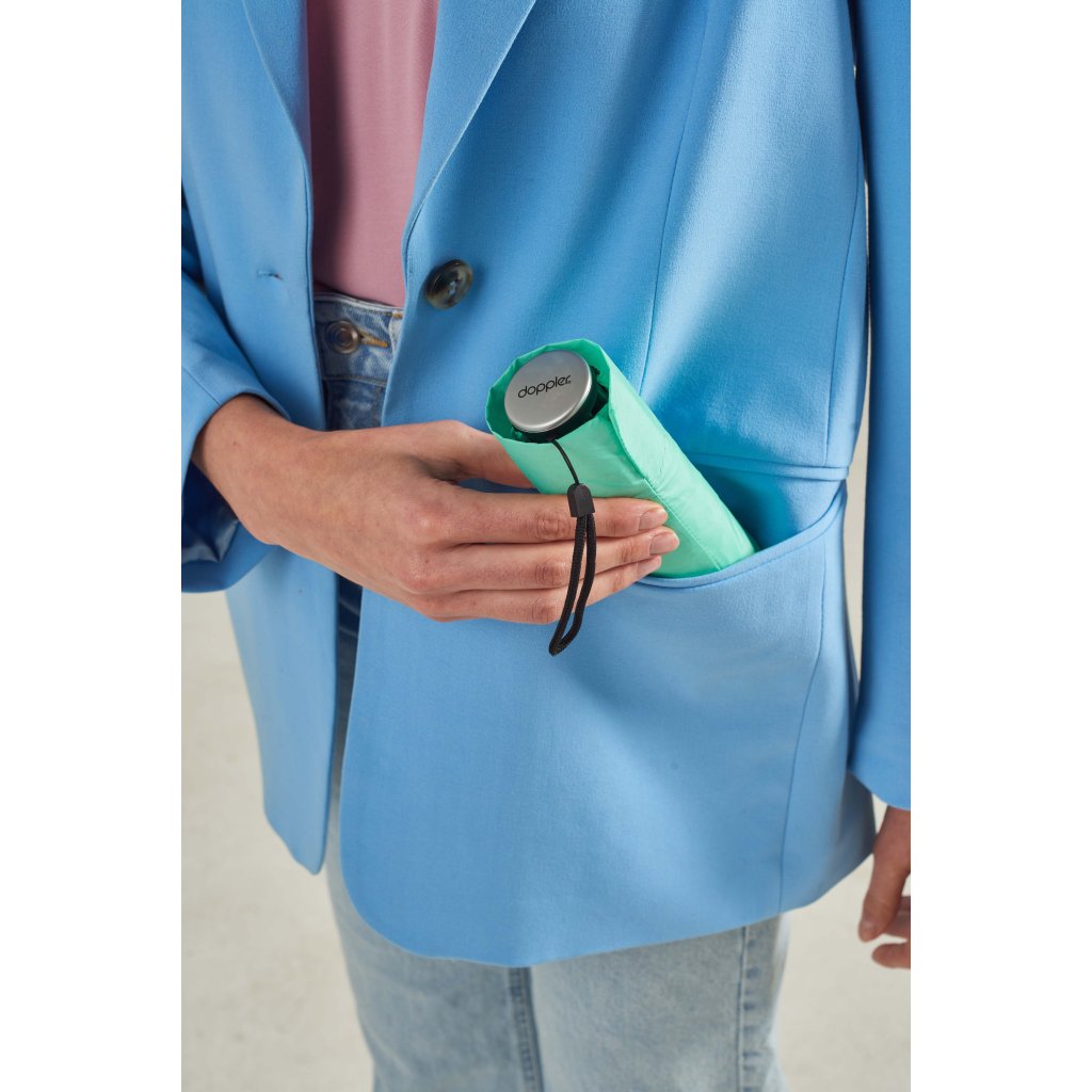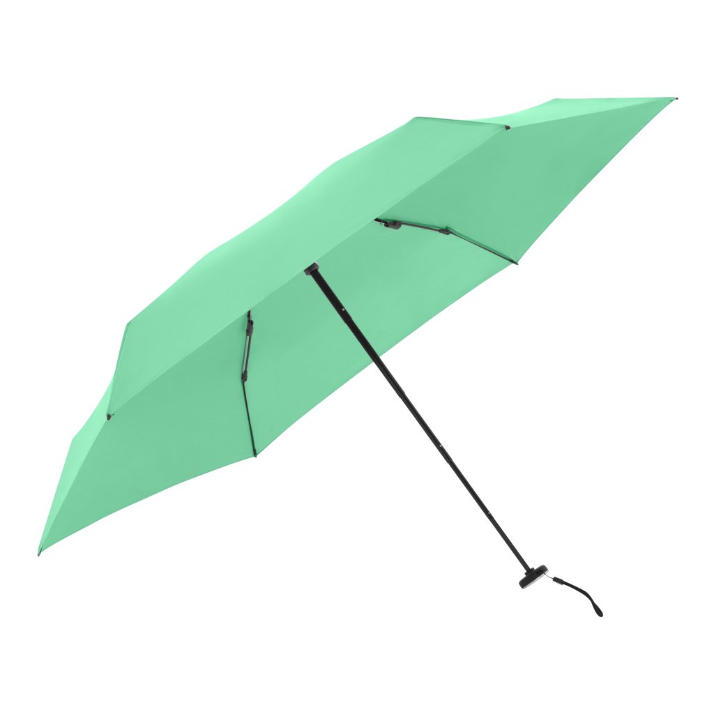 Dámsky skladací dáždnik v extra malom kompaktnom prevedení. Jednofarebný poťah polyester v zelenej farbe. Poťah vyrobený z tenkej tkaniny pongee je príjemný na dotyk a odolný voči zmenám vlhkosti a teplôt, nezráža sa.