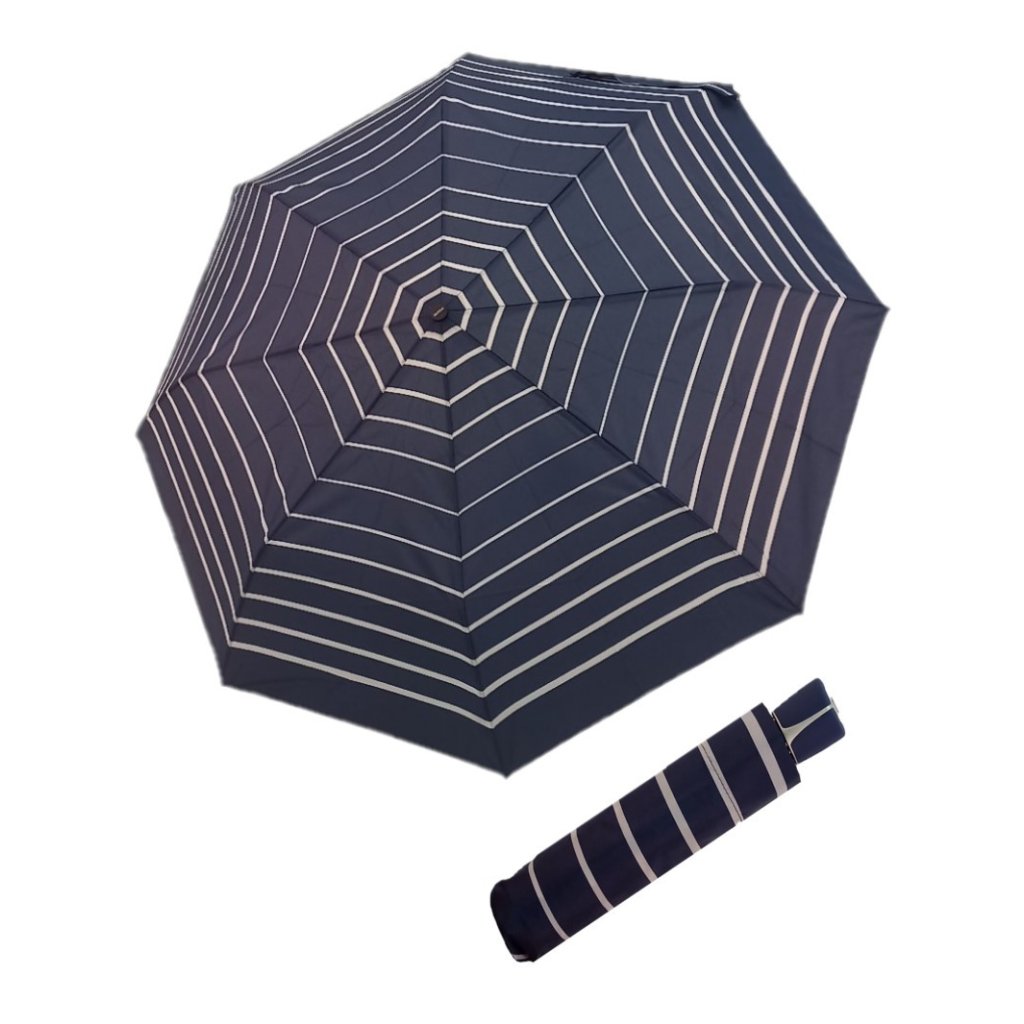 Dámsky skladací dáždnik z kvalitnej konštrukcie zo sklolaminátu, ocele a hliníka. Dáždnik sa ľahko preklopí späť do pôvodnej polohy. Farebne ladiaca rúčka s poťahom. Dáždnik je vhodný do kabelky a má veľkú strechu. Kvalitný ľahký supertenký rýchloschnúci polyesterový poťah.