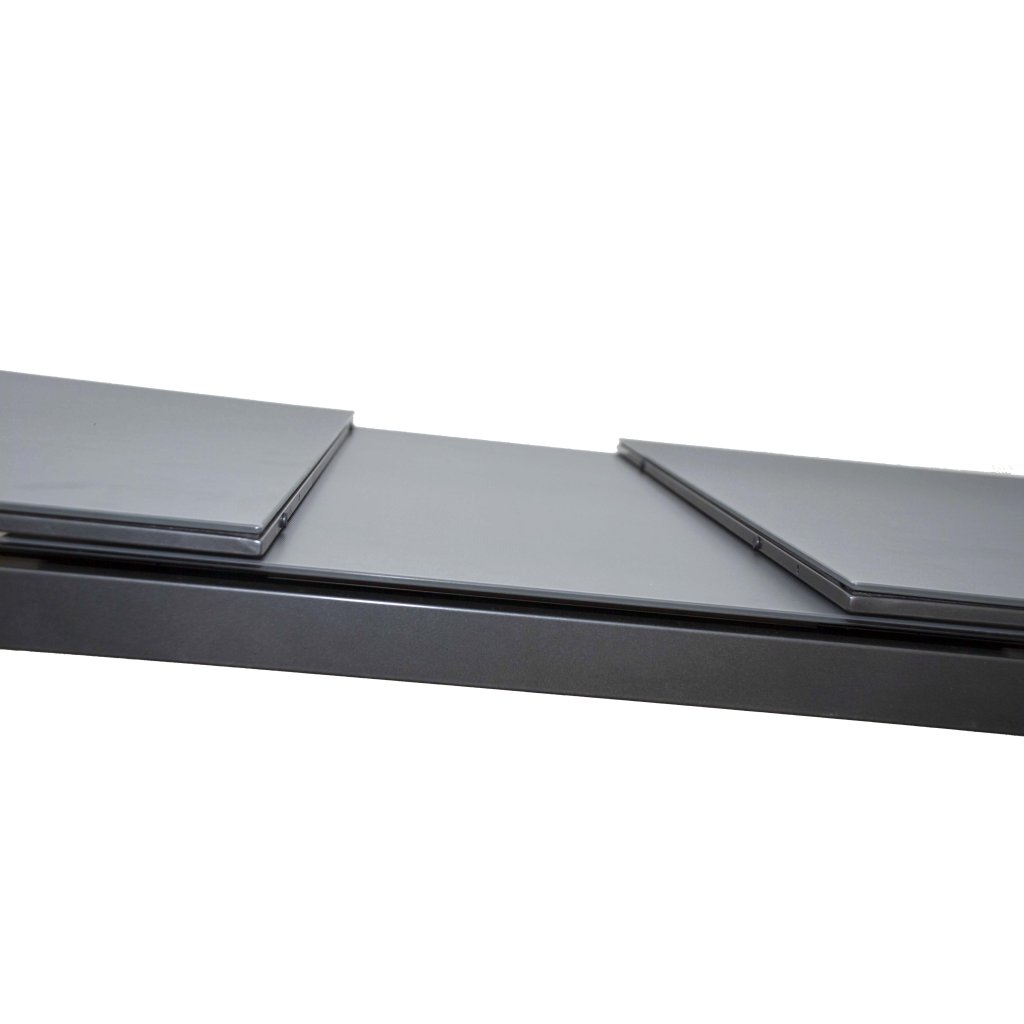 Záhradný rozkladací stôl FIRENZE je moderný vonkajší nábytok minimalistického funkčného dizajnu. Ide o spojenie skla a kovu do elegantného celku. Stôl je stabilný a odolný.Má hliníkovú konštrukciu v antracitovej farbe.Doska stola je z veľmi odolného bezpečnostného tvrdeného skla v tmavosivej farbe. Hrúbka skla je cca 5 mm. Vďaka štruktúrovaniu nie sú na skle vidieť stopy po poškriabaní či odtlačky prstov.