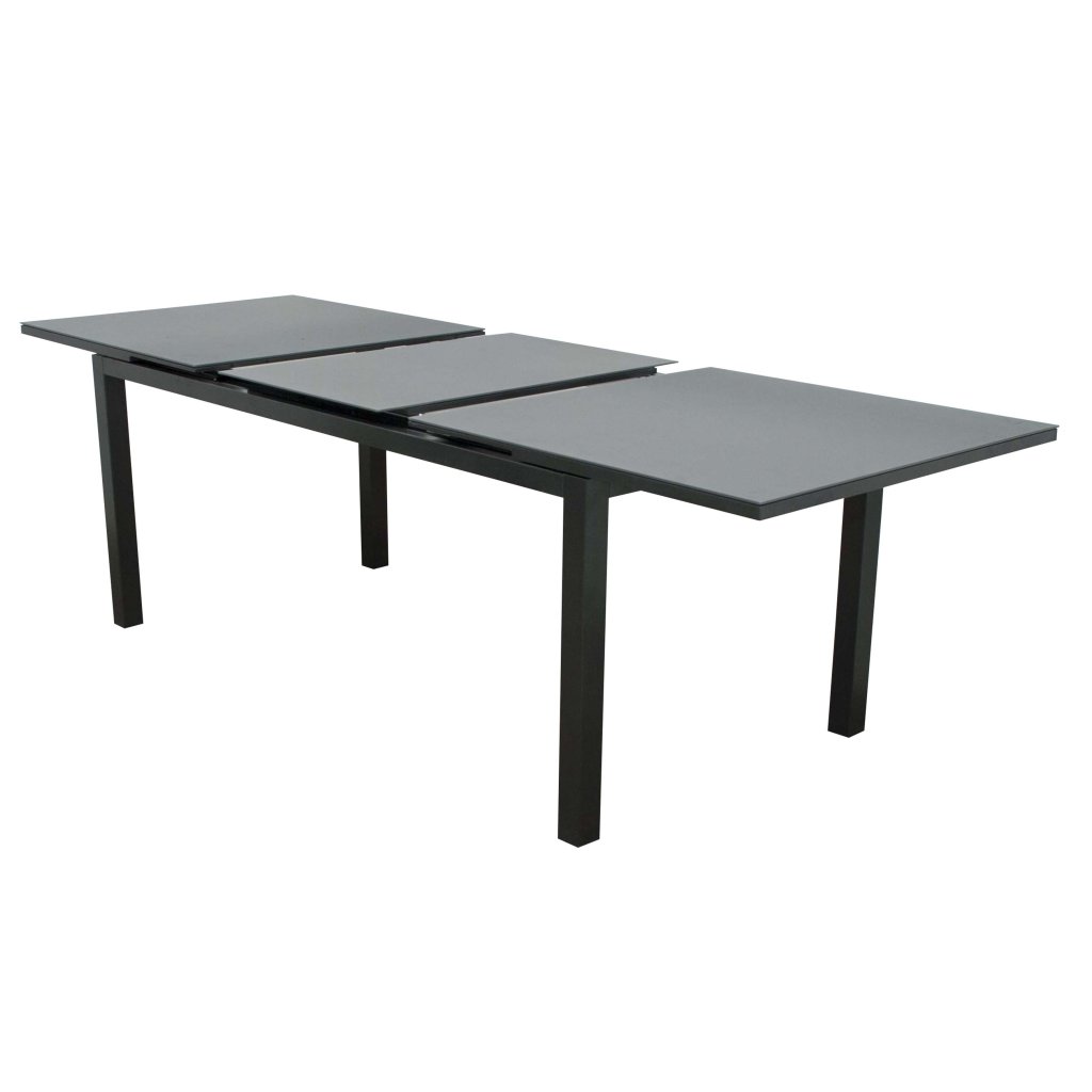 Záhradný rozkladací stôl FIRENZE je moderný vonkajší nábytok minimalistického funkčného dizajnu. Ide o spojenie skla a kovu do elegantného celku. Stôl je stabilný a odolný.Má hliníkovú konštrukciu v antracitovej farbe.Doska stola je z veľmi odolného bezpečnostného tvrdeného skla v tmavosivej farbe. Hrúbka skla je cca 5 mm. Vďaka štruktúrovaniu nie sú na skle vidieť stopy po poškriabaní či odtlačky prstov.