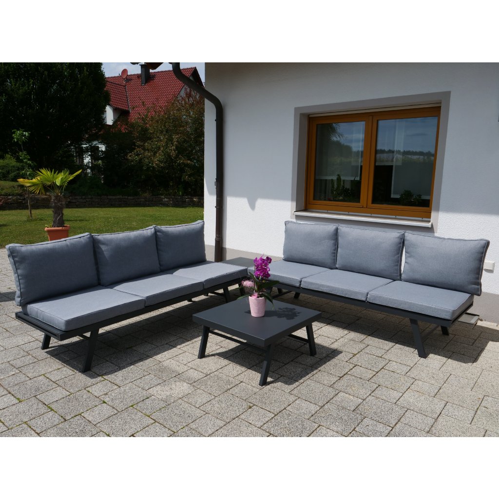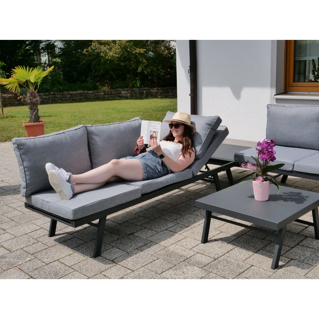 Záhradná relaxačná pohovka HAPPY je multifunkčné riešenie pre každého, kto rád relaxuje na záhrade či terase. Obe strany pohovky majú polohovacie sedacie časti, ktoré možno nastaviť do 5 pozícií a v okamihu si tak vytvoriť pohodlnú pozíciu ako pre vyvýšenie chrbta tak aj nôh. Mäkké čalúnenie má svetlosivé poťahy zo 100% polyesteru, ktorý je odolný v ťahu, dobre odoláva oderu či vplyvom slnečného žiarenia. Zároveň je tkanina veľmi príjemná na dotyk, odpudzuje nečistoty a je rýchloschnúca. Sedáky sú na zipsy, poťah je možné sňať a vyprať. Samozrejmosťou je bezúdržbová a stabilná hliníková konštrukcia opatrená ochranným práškovým nástrekom v antracitovej farbe, ktorej ľahkosť iste oceníte vždy, keď budete chcieť pohovku premiestniť.