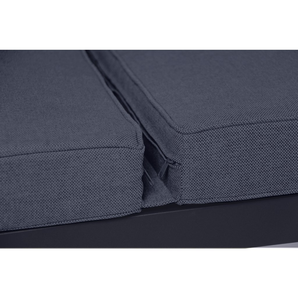 Záhradná relaxačná pohovka HAPPY je multifunkčné riešenie pre každého, kto rád relaxuje na záhrade či terase. Obe strany pohovky majú polohovacie sedacie časti, ktoré možno nastaviť do 5 pozícií a v okamihu si tak vytvoriť pohodlnú pozíciu ako pre vyvýšenie chrbta tak aj nôh. Mäkké čalúnenie má svetlosivé poťahy zo 100% polyesteru, ktorý je odolný v ťahu, dobre odoláva oderu či vplyvom slnečného žiarenia. Zároveň je látka veľmi príjemná na dotyk, odpudzuje nečistoty a je rýchloschnúca. Sedáky sú na zipsy, poťah je možné sňať a vyprať. Samozrejmosťou je bezúdržbová a stabilná hliníková konštrukcia opatrená ochranným práškovým nástrekom v antracitovej farbe, ktorej ľahkosť iste oceníte vždy, keď budete chcieť pohovku premiestniť.