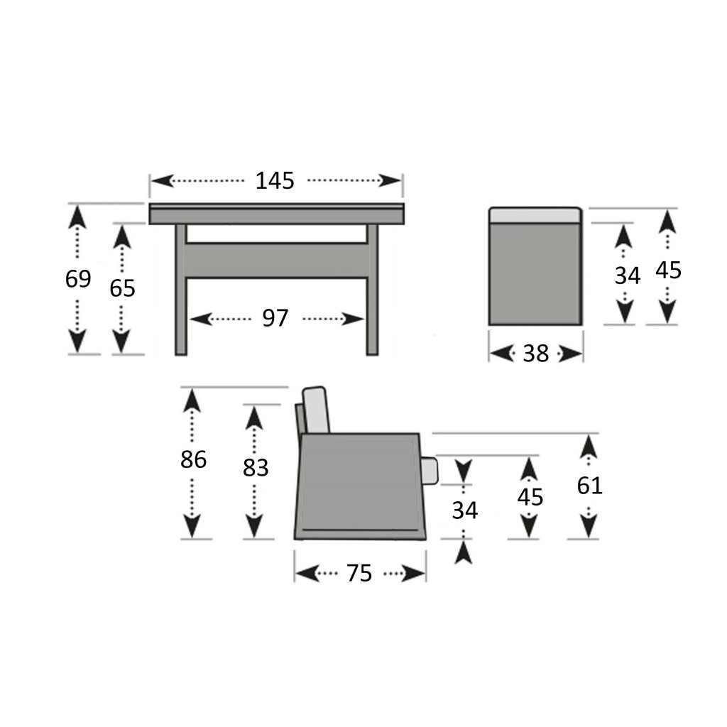 | Obsah setu: | stôl, polster, taburet, sedačka |