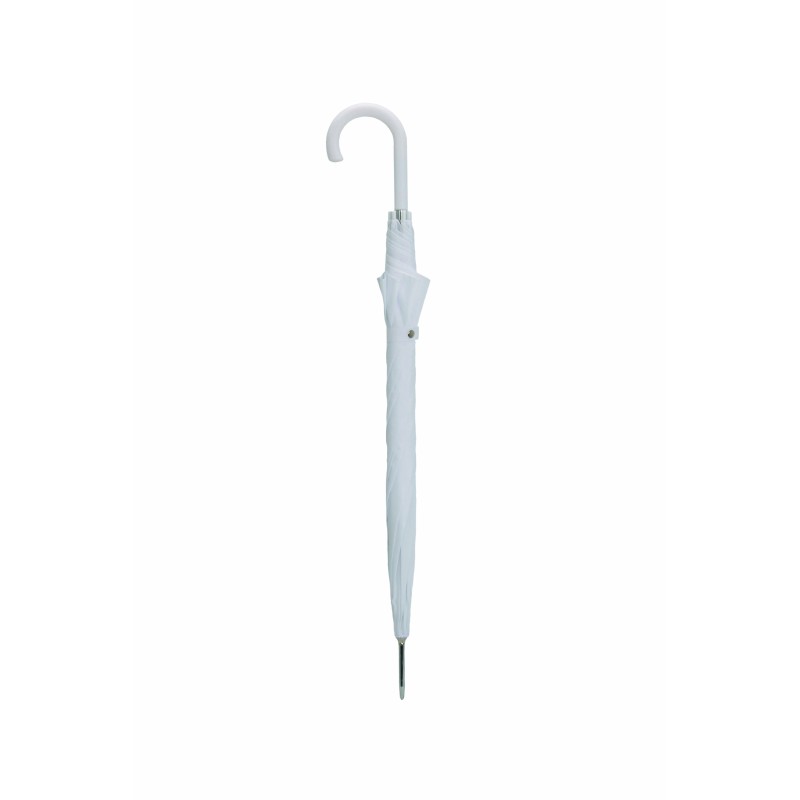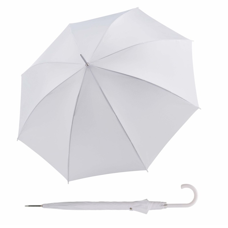 Dámsky holový vystreľovací svadobný dáždnik. Veľmi kvalitná konštrukcia z ocele, je pevná a vetruodolná v striebornej farbe ladiacej s bielym poťahom dáždnika. Veľká strecha. Polyesterový poťah je odolný voči zmenám vlhkosti a teplôt, nezráža sa.