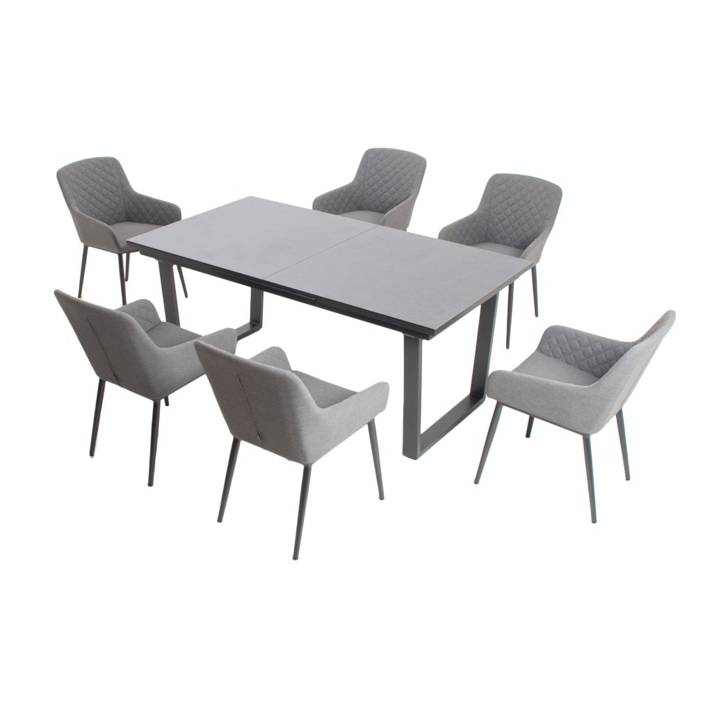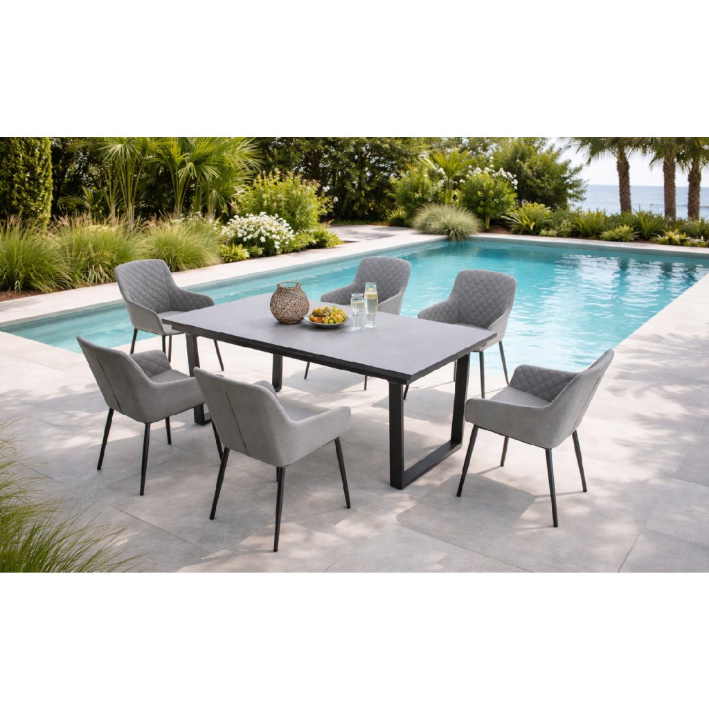 Táto luxusná súprava je vhodná pre každého, kto hľadá elegantný nábytok s mimoriadnou odolnosťou voči nepriazni počasia. Súprava sa skladá zo 6 čalúnených kresiel a veľkého rozkladacieho hliníkového stola.
