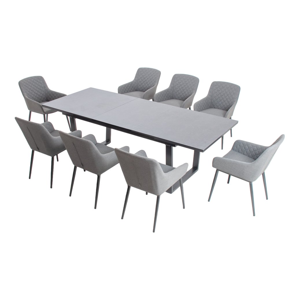 Táto luxusná súprava je vhodná pre každého, kto hľadá elegantný nábytok s mimoriadnou odolnosťou voči nepriazni počasia. Súprava pozostáva z 8 polstrovaných kresiel a veľkého rozkladacieho hliníkového stola.