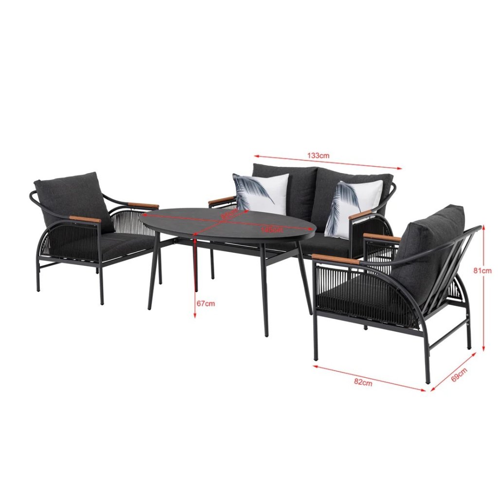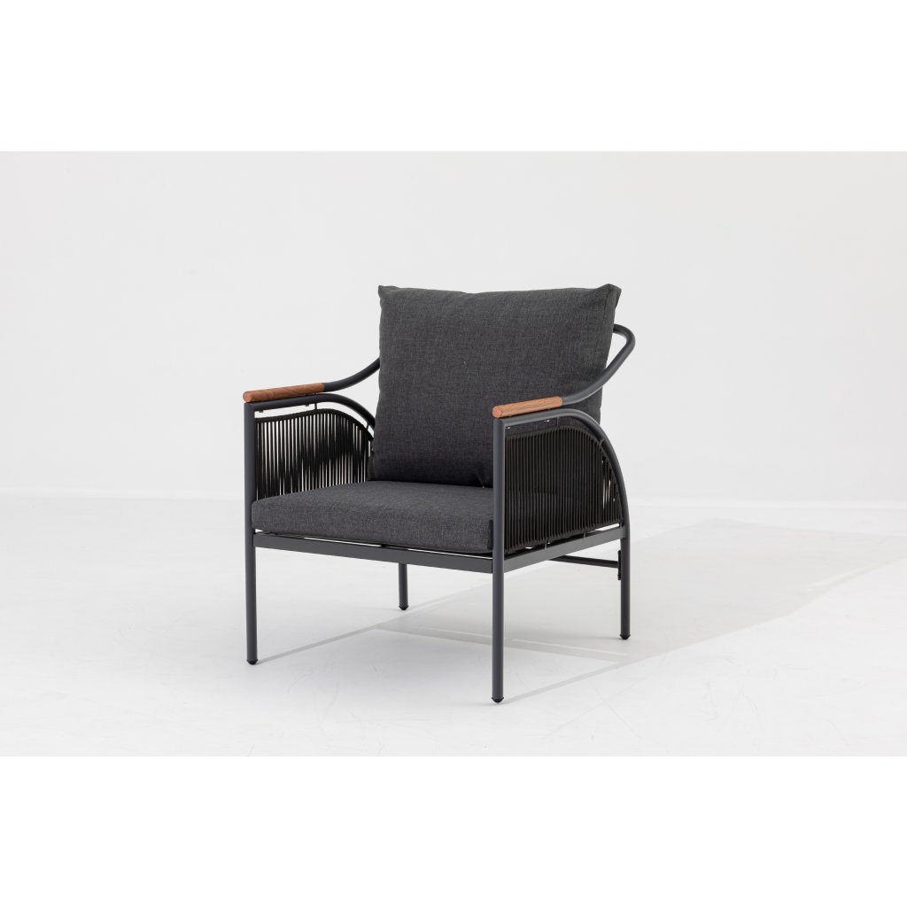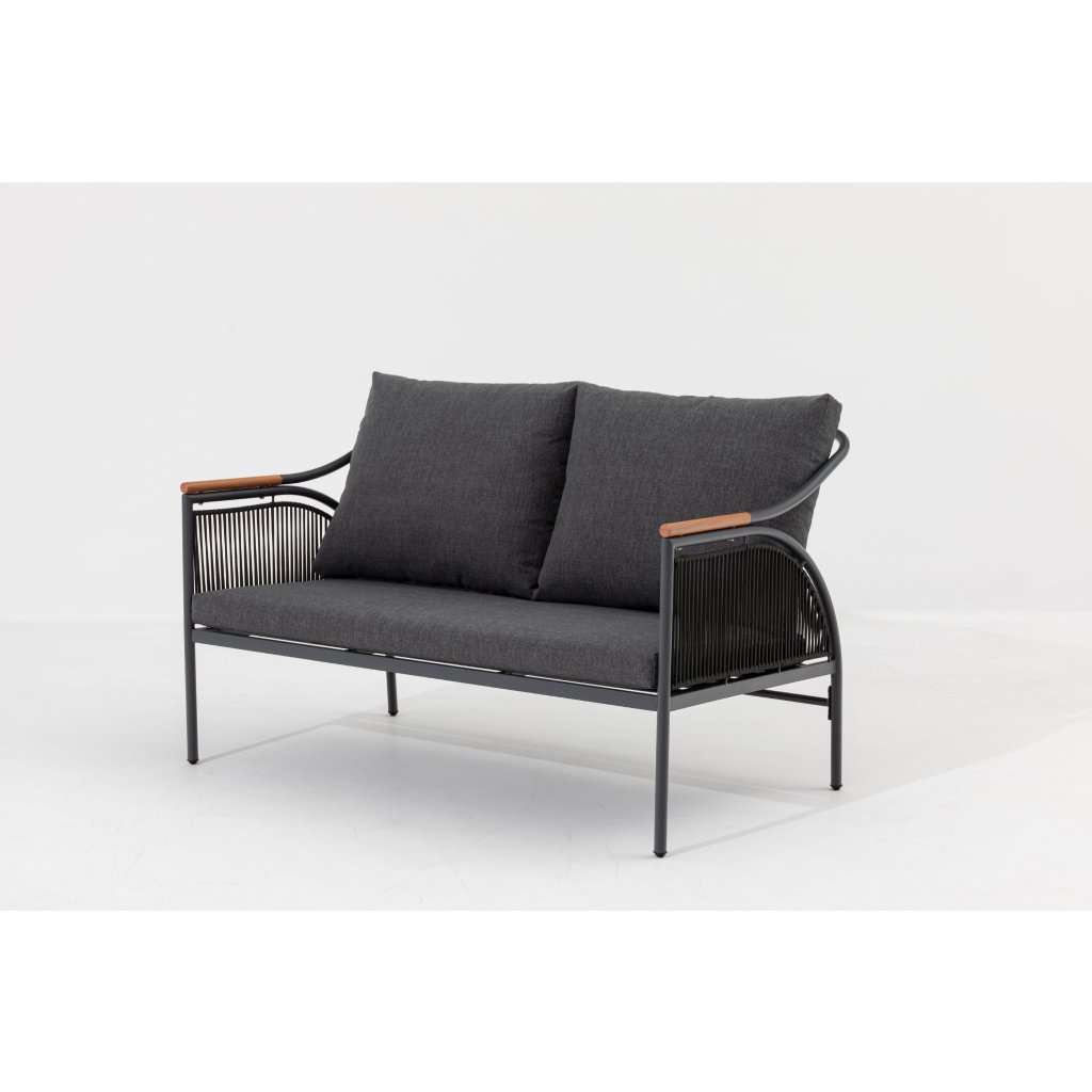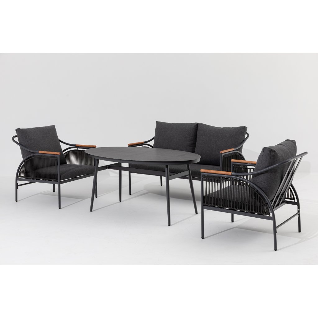 Lucca Set sa vyznačuje elegantným výpletom na bokoch, ktorý dodáva celej súprave vzdušný a sofistikovaný vzhľad. Oceľová konštrukcia v antracitovej farbe zaisťuje stabilitu a moderný štýl, zatiaľ čo podrúčky pohovky a kresiel v prírodnom odtieni dreva vytvárajú príjemný kontrast.
