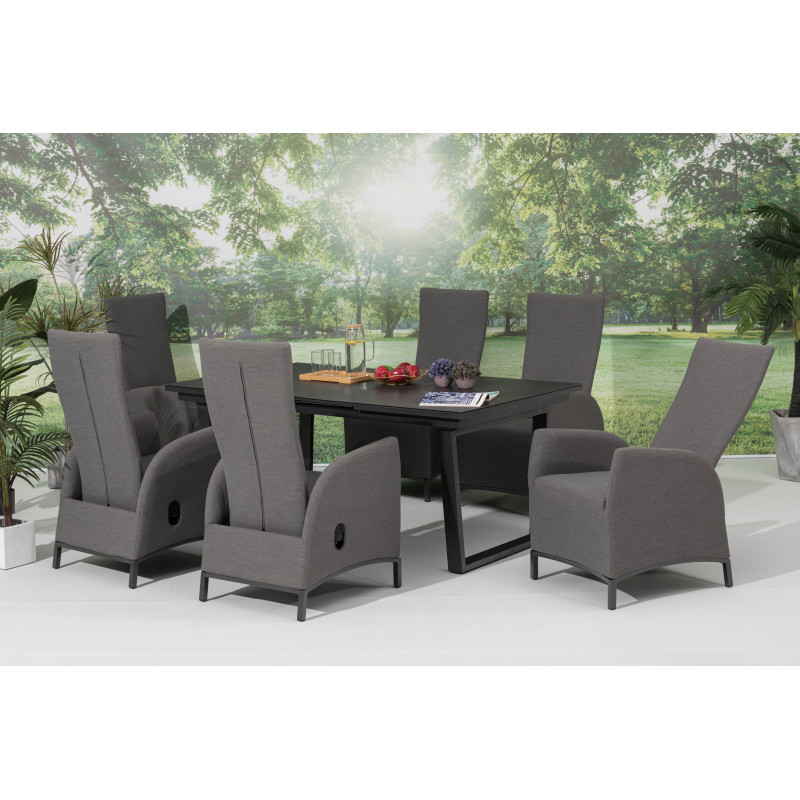 Táto luxusná súprava je vhodná pre každého, kto hľadá elegantný nábytok s mimoriadnou odolnosťou voči nepriazni počasia. Zostava sa skladá zo 6 polohovacích kresiel a rozkladacieho stola s rozmermi 180/240 x 100 cm.