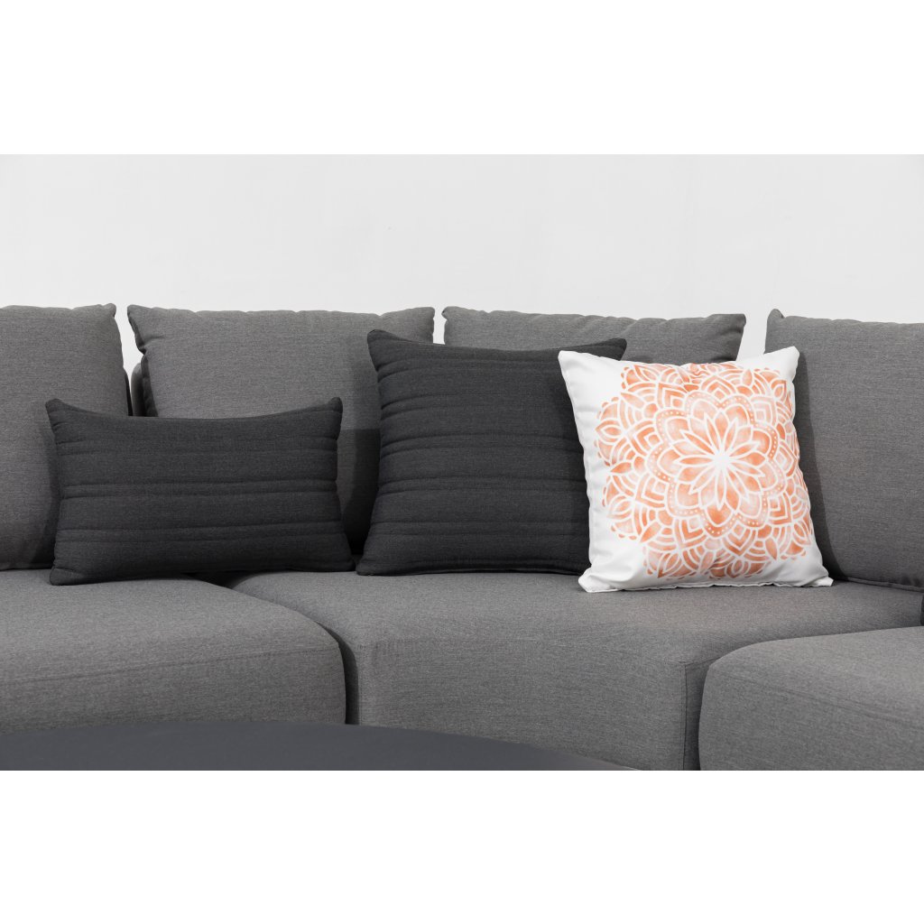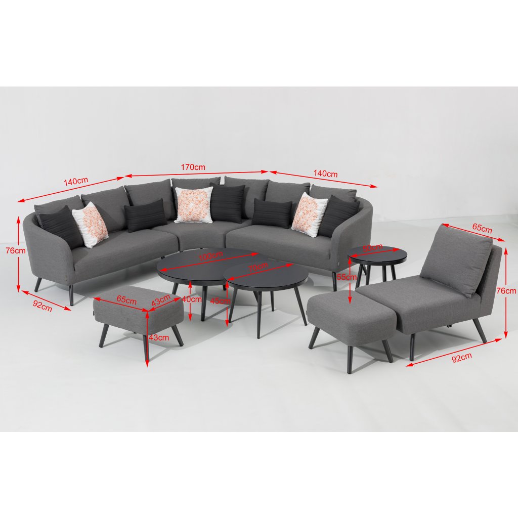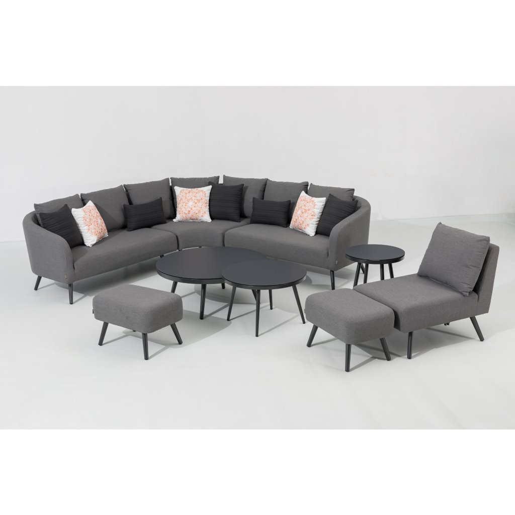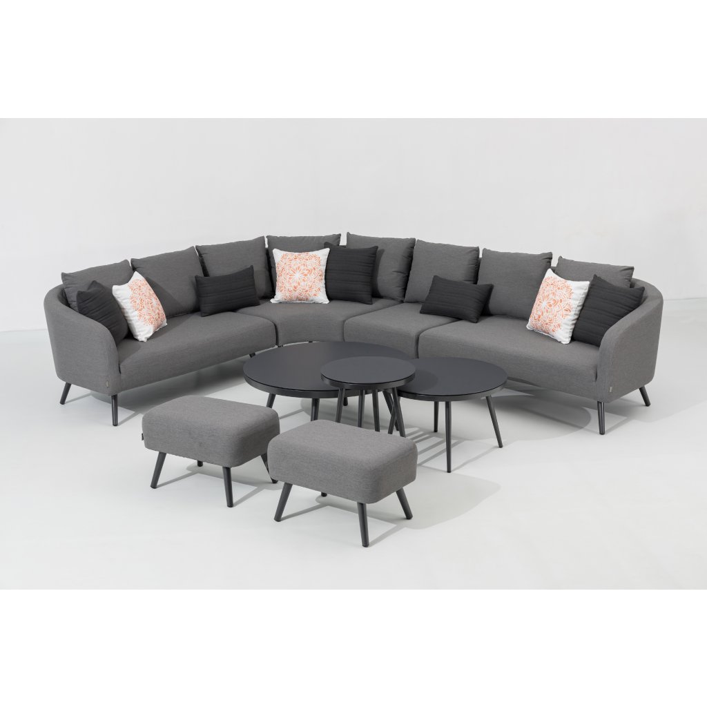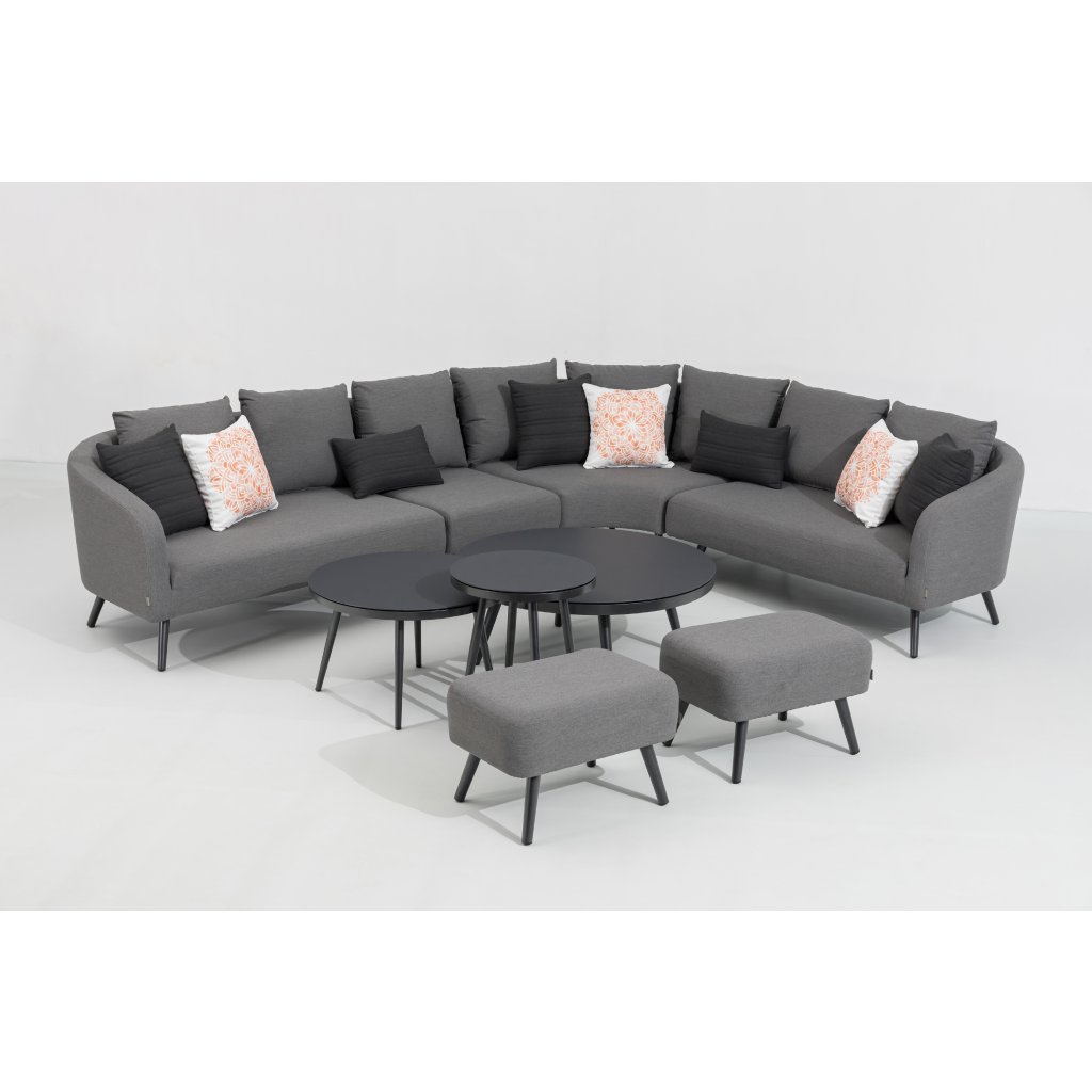 Luxusná záhradná súprava, ktorá môže byť celoročne vonku. Pri relaxácii sa budete cítiť ako v obývačke, ale zároveň si môžete užívať čerstvý vzduch. Súprava sa skladá z rohovej pohovky, dvoch taburetov a troch stolíkov. Súčasťou celej súpravy je aj 8 dekoračných vankúšikov. Je veľmi variabilná, možno ju otočiť či rozšíriť. Konštrukcia je vyrobená z ľahkého odolného a bezúdržbového hliníka. Polstrovanie celej zostavy je z tkaniny LIKA-TEX, výplň z rýchloschnúcej peny, to zaručuje rýchle preschnutie po daždi a zostava môže zostať celú sezónu vonku. Súčasťou sú nadýchané sivé polstre, poťahy sú snímateľné (možno ich prať) a sú vyrobené z vysoko kvalitnej textílie LIKA-TEX®. Dosky stolov sú z 5 milimetrového skla s nástrekom kameniny.