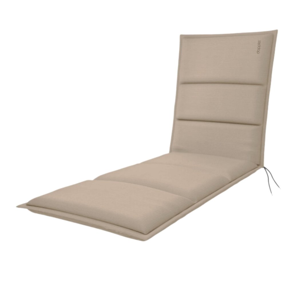 Poduška na záhradné lehátko radu CITY. Elegantná poduška v módnom odtieni, zdobená výšivkou Doppler na opieradle. Poduška je v prevedení s obšitým lemom, prešitá 1x v sedáku, 2x v opieradle. Uchytenie je pomocou posuvnej spony. Vďaka spone si môžete nastaviť veľkosť podľa rozmeru a druhu stoličky, spona je pevná a nevyťahuje sa. Upevnenie sedadla je pomocou dvoch šnúrok v ohybe podušky. Hrúbka podušky je optimálna pre všetky druhy stoličiek. Prevedenie je vhodné aj do náročných podmienok kaviarní, záhradiek a reštaurácií. Poťah je nesnímateľný.