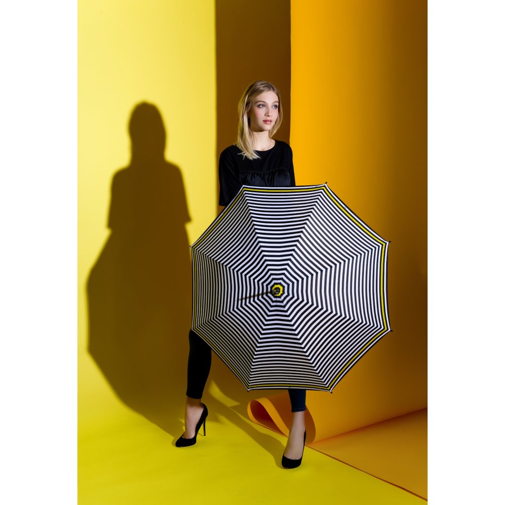 Mini Triple je dámsky mechanický dáždnik v pruhovanom vzore v čierno - bielej farbe a so žltými detailmi.