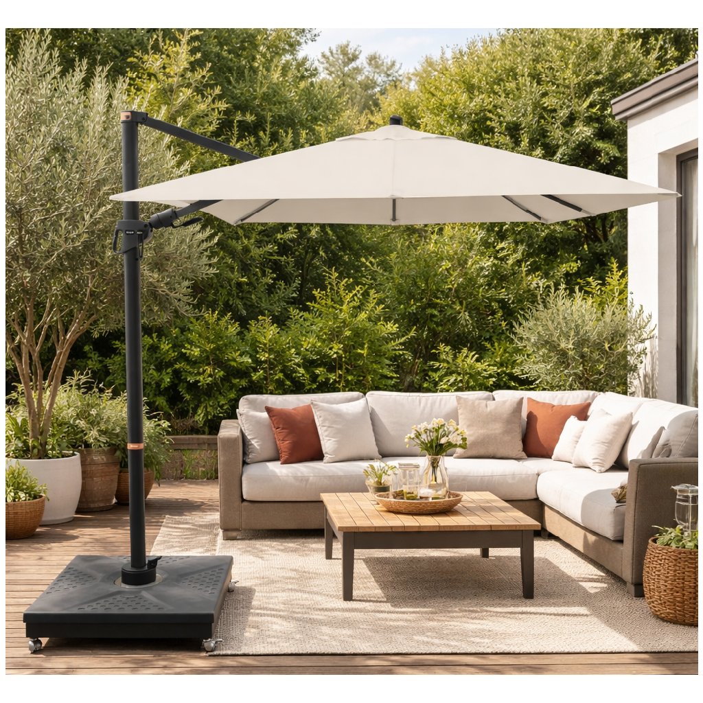 Vďaka štvorcovej streche je slnečník obzvlášť vhodný na zatienenie záhradného nábytku. Slnečník je možné tiež otáčať o 360 stupňov, osovo natáčať na obe strany a naklápať dozadu v siedmich polohách.