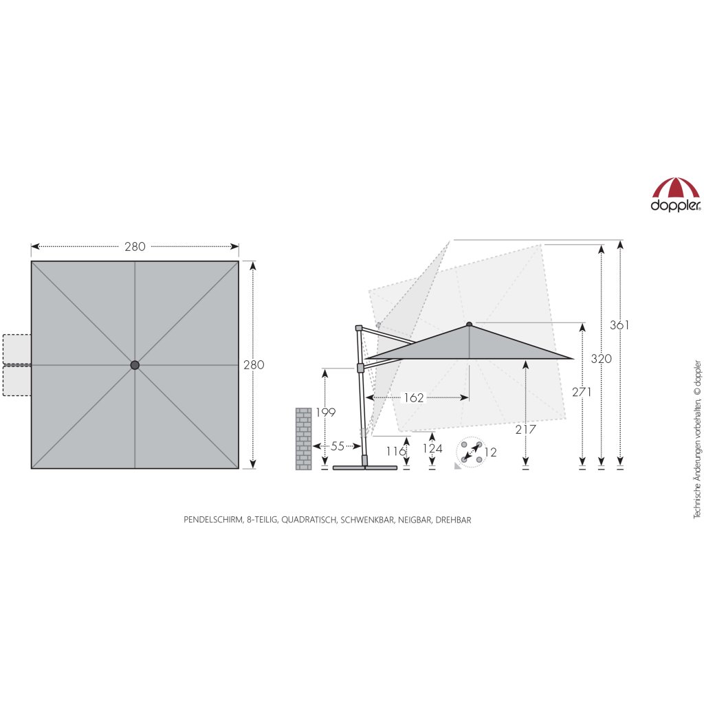 Vďaka štvorcovej streche je slnečník obzvlášť vhodný na zatienenie záhradného nábytku. Slnečník je možné tiež otáčať o 360 stupňov, osovo natáčať na obe strany a naklápať dozadu v siedmich polohách.