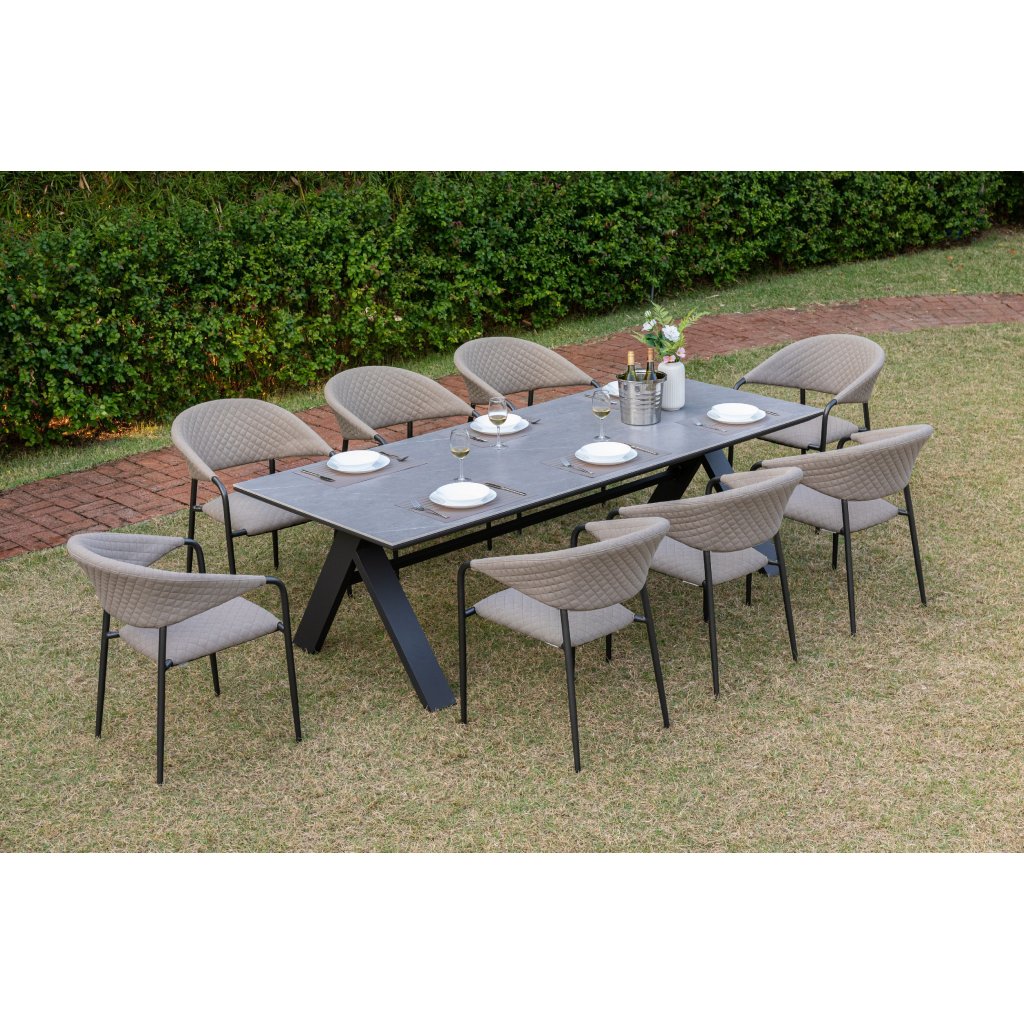 Stôl Nova vyniká svojim minimalistickým dizajnom a použitím vysoko kvalitných materiálov. Jeho robustná hliníková konštrukcia v antracitovej farbe zaisťuje stabilitu a dlhú životnosť, zatiaľ čo doska zo spekaného kameňa dodáva stolu luxusný vzhľad a výnimočné vlastnosti. Tento inovatívny materiál sa pýši vysokou odolnosťou voči poškriabaniu, škvrnám a poveternostným vplyvom. Neporézny povrch dosky je ľahký na údržbu, takže sa stôl ľahko čistí a vždy vyzerá ako nový. Vďaka regulačným kolieskam na nohách možno stôl vyrovnať aj na nerovnom povrchu, čo zaisťuje jeho dokonalú stabilitu.