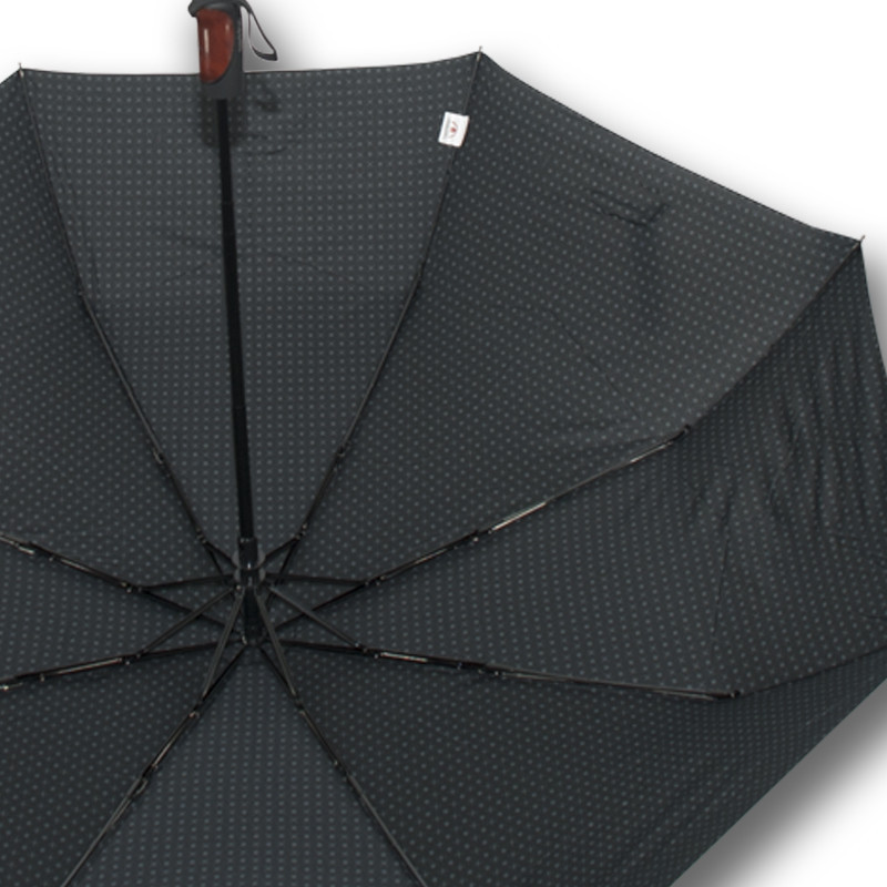 Partnerský, plne automatický skladací dáždnik. Poťah čierny so šedými a striebornými pruhmi. Veľmi kvalitná konštrukcia zo sklolaminátu, ocele a karbónu. Posledné dva diely zo sklolaminátu. Pri prevrátení dáždnika vetrom nedôjde k jeho poškodeniu, dáždnik sa ľahko preklopí späť do pôvodnej polohy. Veľká strecha a praktické púzdro na zips. Polyesterový poťah je odolný voči zmenám vlhkosti a teplôt, nezráža sa.