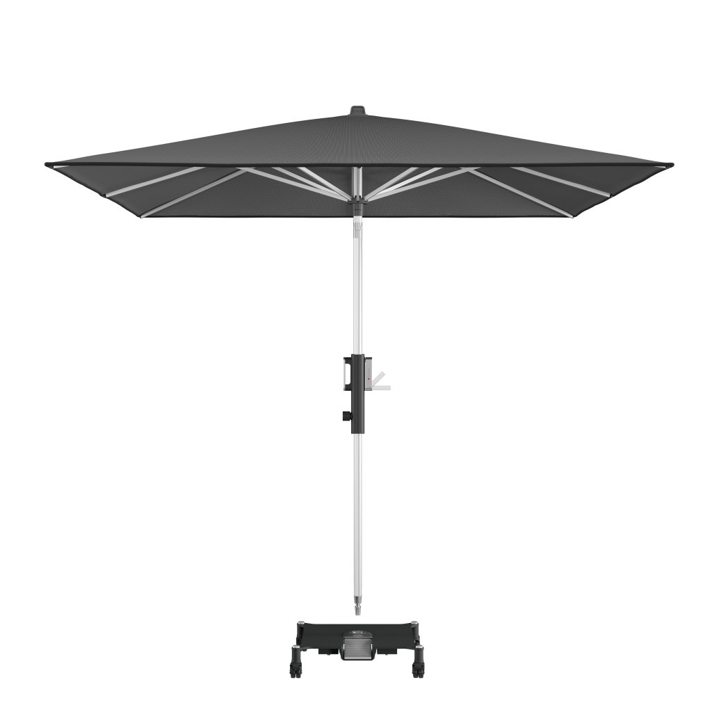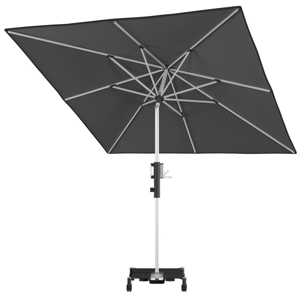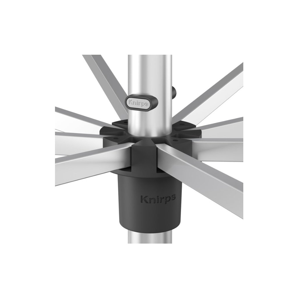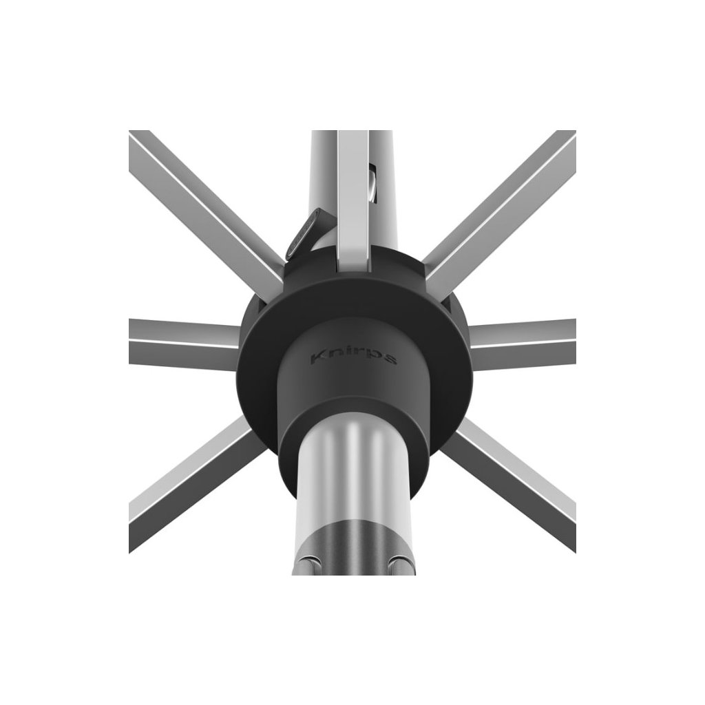 Luxusný záhradný slnečník od prémiovej značky Knirps je výškovo nastaviteľný až o 15 cm a vybavený kľukovým mechanizmom umožňujúcim ľahké naklápanie. Má ľahkú a pevnú hliníkovú konštrukciu a kvalitný poťah z PET recyklovanej polyesterovej látky s vysokou ochranou pred UV žiarením SPF 80. Hliníkovú konštrukciu je možné ľahko uzamknúť do zodpovedajúceho stojana - bez ohýbania alebo skrutkovania.