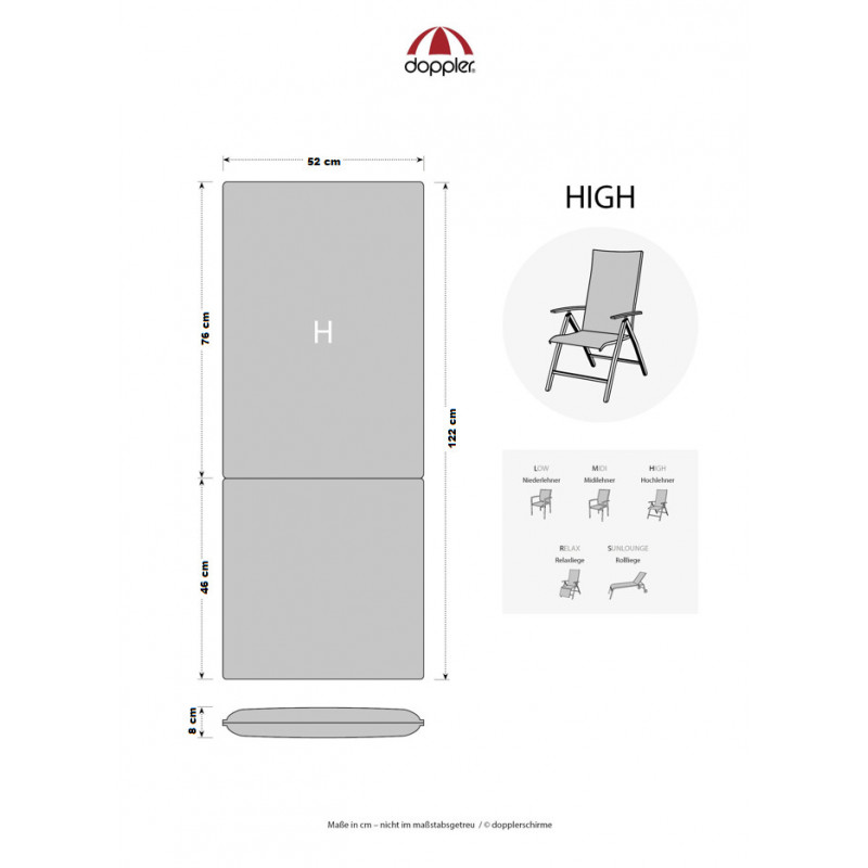 Poduška s vysokou opierkou na záhradný nábytok rady MOTION XL má extra silný sedák s opierkou, ktorý je v elegantnom prevedení s obšitým lemom, prešitý krúžkovo 4x v operadle. Uchytenie je pomocou posuvnej spony. Vďaka spone si môžete nastaviť veľkosť podľa rozmeru a druhu stoličky, spona je pevná a nevyťahuje sa. Upevnenie sedadla je pomocou dvoch šnúrok v ohybe podušky. Prevedenie je vhodné aj do náročných podmienok kaviarní, záhradiek a reštaurácií. Poťah je ošetrený špeciálnou impregnáciou proti plesni a špine. Vďaka tejto impregnácii zostávajú nečistoty na povrchu impregnácie a nedostávajú sa do jednotlivých vlákien poťahu a látka sa tak ľahko čistí iba navlhčenou handričkou alebo hubkou a polster je odolnejší voči vlhkosti. Pozor, polster nie je nepremokavý. Poťah je nesnímateľný.