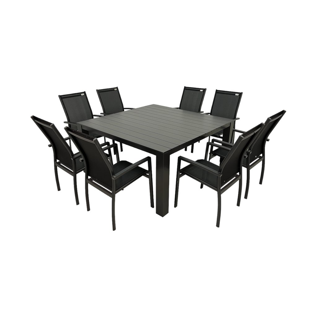 - Priestranný a stabilný štvorcový hliníkový stôl s rebrovanou doskou