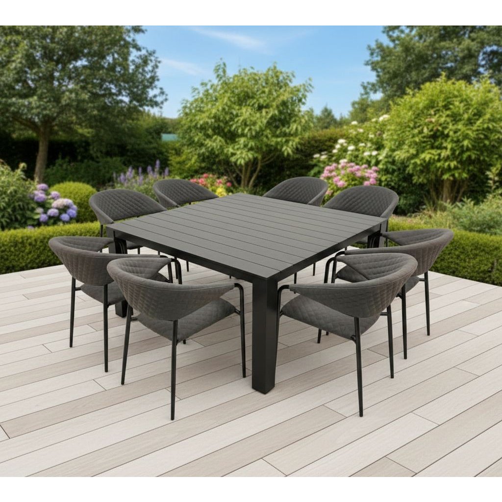 Moderný veľký štvorcový záhradný jedálenský stôl nadčasového dizajnu s masívnou, stabilnou hliníkovou konštrukciou v antracitovej farbe. Stôl je vhodný pre väčšie plochy terás alebo záhrad. Doska stola je hliníková, rebrovaná. Stôl je robustný a zároveň ľahký a stabilný.