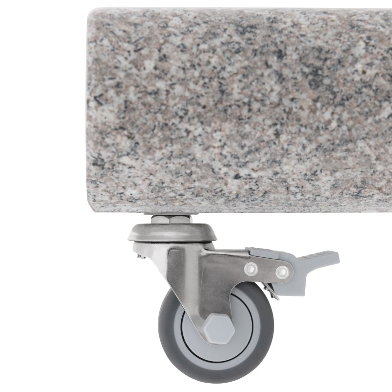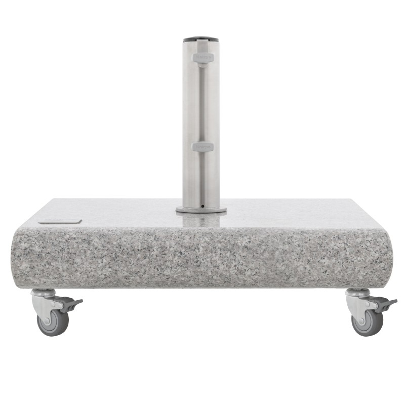 Tento prémiový pojazdný stojan značky Knirps je vyrobený z kvalitnej svetlej leštenej žuly a vyniká svojim luxusným spracovaním. Je opatrený stojnou tyčou z nerezovej ocele a dvoma zaisťovacími skrutkami pre bezpečné ukotvenie. Pre ľahšie presúvanie je stojan navyše vybavený kolieskami. Súčasťou balenia sú redukčné krúžky vrátane vložiek, ktoré sú určené pre stredové slnečníky s priemerom stojnej tyče od 32 do 60 mm (vždy je nutné zohľadniť veľkosť slnečníka a odporúčané minimálne zaťaženie každého modelu).
