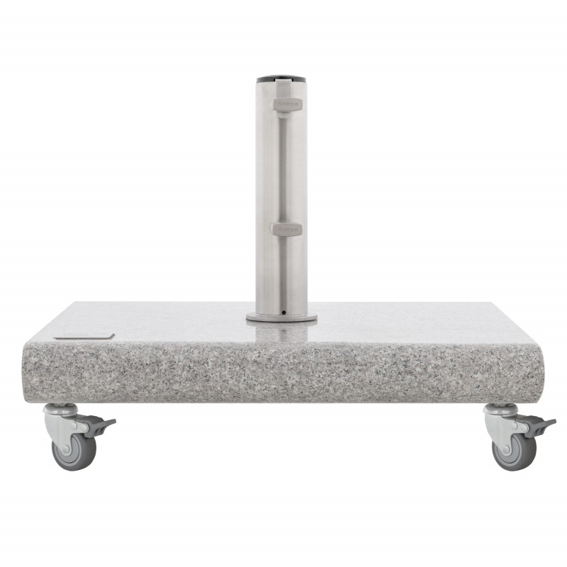 Tento prémiový pojazdný stojan značky Knirps je vyrobený z kvalitnej svetlej leštenej žuly a vyniká svojim luxusným spracovaním. Je opatrený stojnou tyčou z nerezovej ocele a dvoma zaisťovacími skrutkami pre bezpečné ukotvenie. Pre ľahšie presúvanie je stojan navyše vybavený kolieskami. Súčasťou balenia sú redukčné krúžky vrátane vložiek, ktoré sú určené pre stredové slnečníky s priemerom stojnej tyče od 32 do 60 mm (vždy je nutné zohľadniť veľkosť slnečníka a odporúčané minimálne zaťaženie každého modelu).