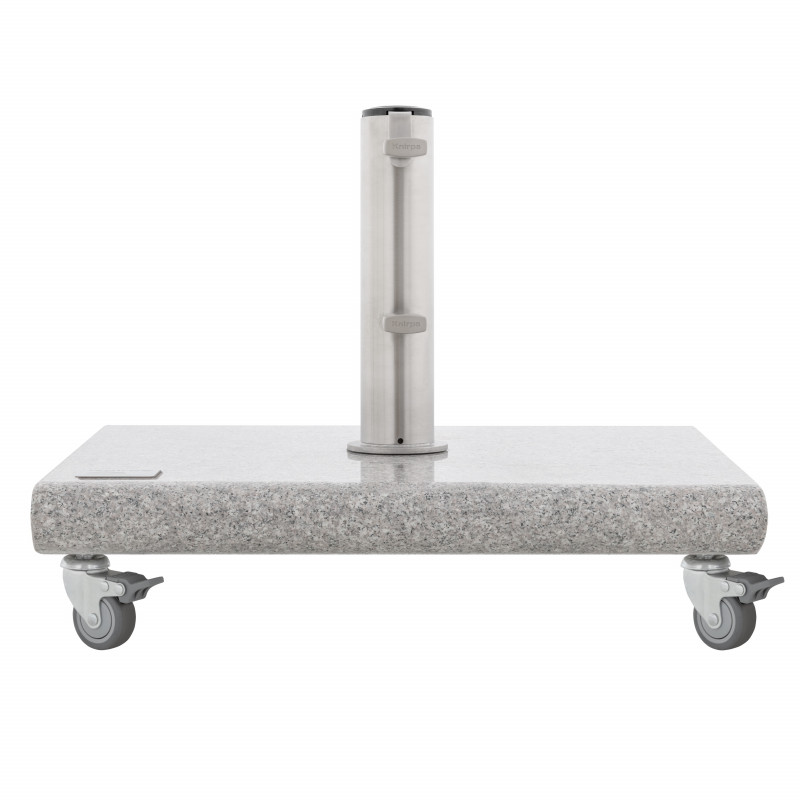 Tento prémiový pojazdný stojan značky Knirps je vyrobený z kvalitnej svetlej leštenej žuly a vyniká svojim luxusným spracovaním. Je opatrený stojnou tyčou z nerezovej ocele a dvoma zaisťovacími skrutkami pre bezpečné ukotvenie. Pre ľahšie presúvanie je stojan navyše vybavený kolieskami. Súčasťou balenia sú redukčné krúžky vrátane vložiek, ktoré sú určené pre stredové slnečníky s priemerom stojnej tyče od 32 do 60 mm (vždy je nutné zohľadniť veľkosť slnečníka a odporúčané minimálne zaťaženie každého modelu).