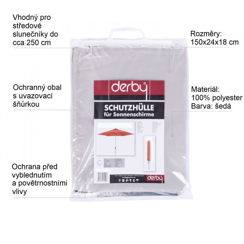 S týmto krytom je váš slnečník bezpečne chránený pred poveternostnými vplyvmi a vyblednutím pred slnkom. Použitie ochranného krytu výrazne zvyšuje životnosť slnečníka. Ochranný kryt je vyrobený zo 100% polyesterovej tkaniny odolné voči poveternostným vplyvom. Je vybavený zaväzovacou šnúrkou.