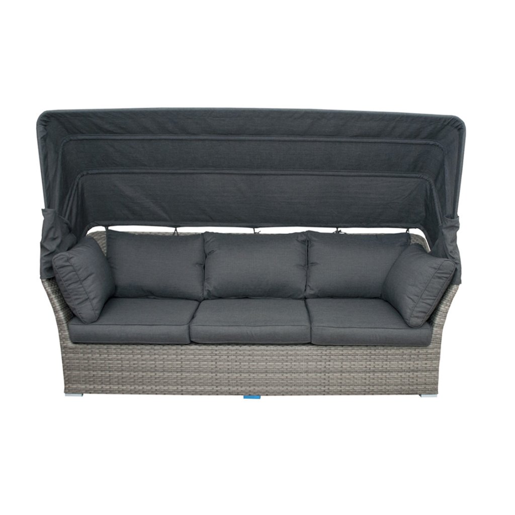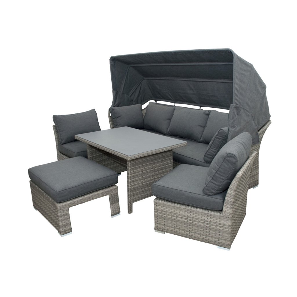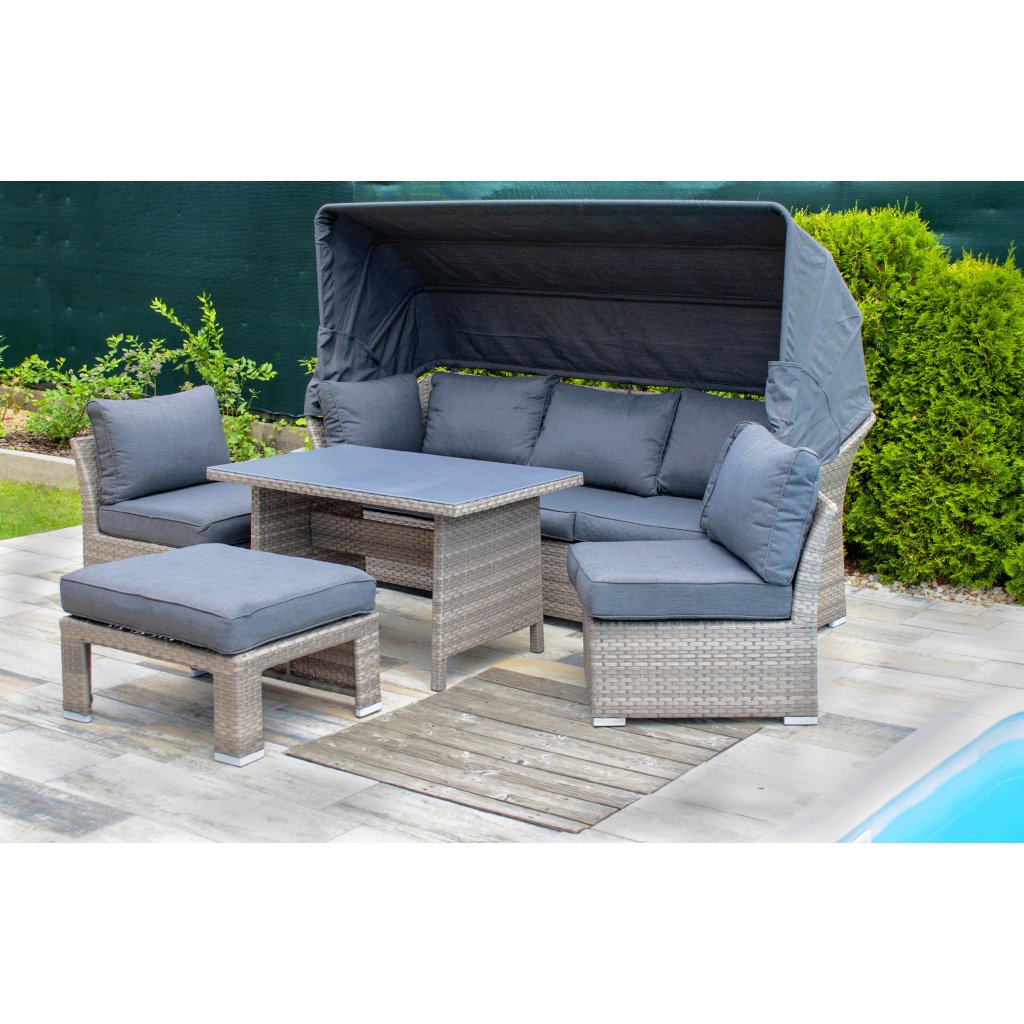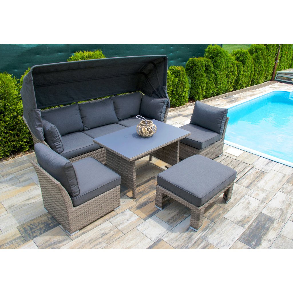 Všetko dopĺňa väčší stôl s rozmermi 113 x 74 cm, s perfektnou výškou 67 cm, pri ktorom sa pohodlne najete, a ďalej potom druhý, prídavný stolík, ktorý poslúži ako odkladací. Všetky možnosti zostavenia si prezrite vo fotogalérii. Prostredníctvom strechy, ktorá je upevnená nad hlavnou pohovkou si môžete kedykoľvek zostavu zatieniť alebo v opačnom prípade strechu stiahnuť dole a užívať si slnečných lúčov.