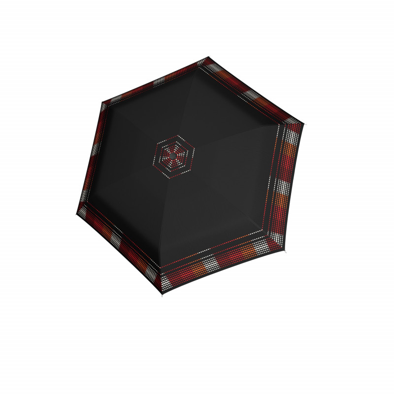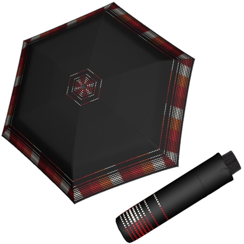 Dámsky skladací dáždnik z kvalitnej konštrukcie zo sklolaminátu, ocele a hliníka. Dáždnik sa ľahko preklopí späť do pôvodnej polohy. Farebne ladiaca rúčka s poťahom. Dáždnik je vhodný do kabelky a má veľkú strechu. Kvalitný ľahký supertenký rýchloschnúci polyesterový poťah.