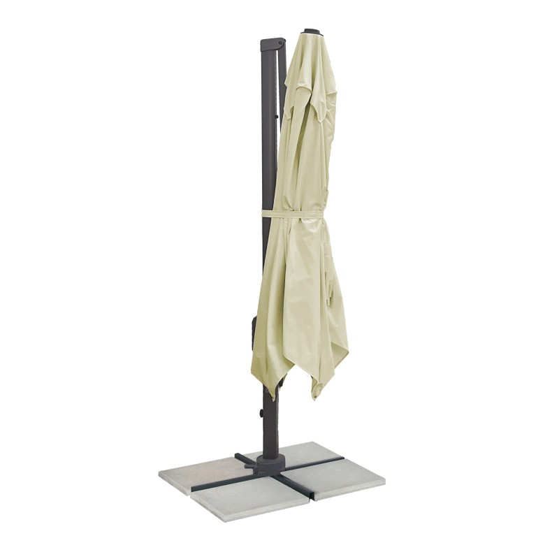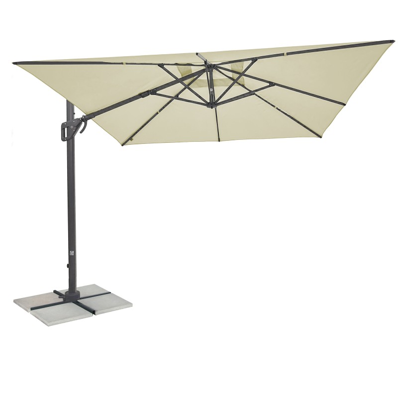 Slnečník s hliníkovou konštrukciou, ktorý má elegantný a komfortný mechanizmus na jednoduchšiu manipuláciu. Poťah je vyrobený z polyesterovej tkaniny a je vodoodpudivý, má veľmi dobrú ochranu pred UV žiarením SPF 50+. Súčasťou slnečníka je aj stojan (bez dosiek 50 x 50 x 4 cm). Slnečník je otočný o 360° a dá sa naklápať pozdĺž hlavnej tyče, čo umožňuje zatienenie po celý deň podľa potreby.