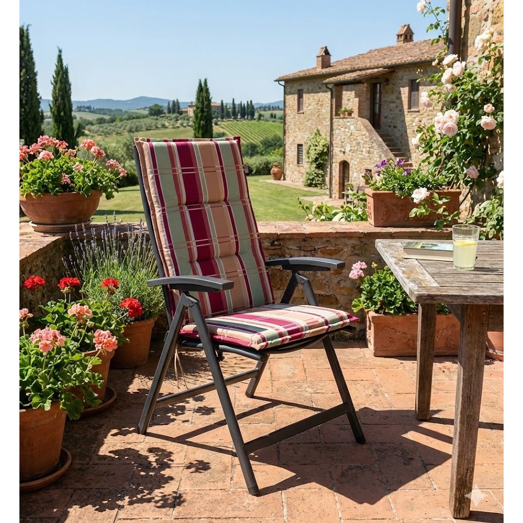Poduška s vysokou opierkou na záhradný nábytok radu SPOT je v prevedení s obšitým lemom, prešitá 2x v operadle. Uchytenie pomocou posuvnej spony alebo pevnej gumy. Vďaka spone si môžete nastaviť veľkosť podľa rozmeru a druhu stoličky, spona je pevná a nevyťahuje sa. Upevnenie sedadla je pomocou šnúrok v ohybe poťahu. Poťah poťahu je nesnímateľný.