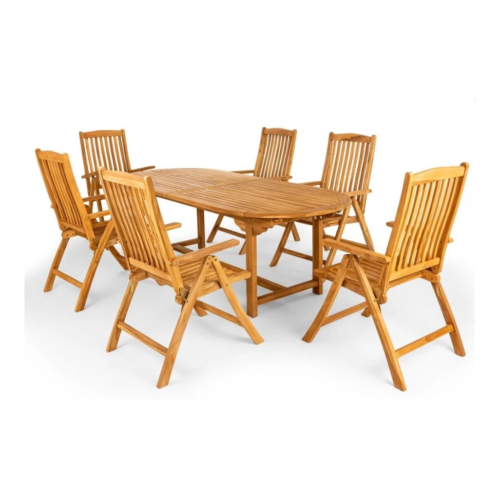 Moderná súprava z teakového dreva je vhodná pre všetkých, ktorí chcú premeniť svoju záhradu či terasu na zónu oddychu a relaxácie. Súprava pozostáva zo 6 polohovacích kresiel a veľkého oválneho rozkladacieho stola 240/300 x 100 cm z teakového dreva. Je to mimoriadne odolné, vysoko trvanlivé a pevné. Kreslá sa dajú ľahko rozložiť a zložiť, takže zaberú minimum skladovacej plochy. Pri stole sa môže usadiť aj početná návšteva.